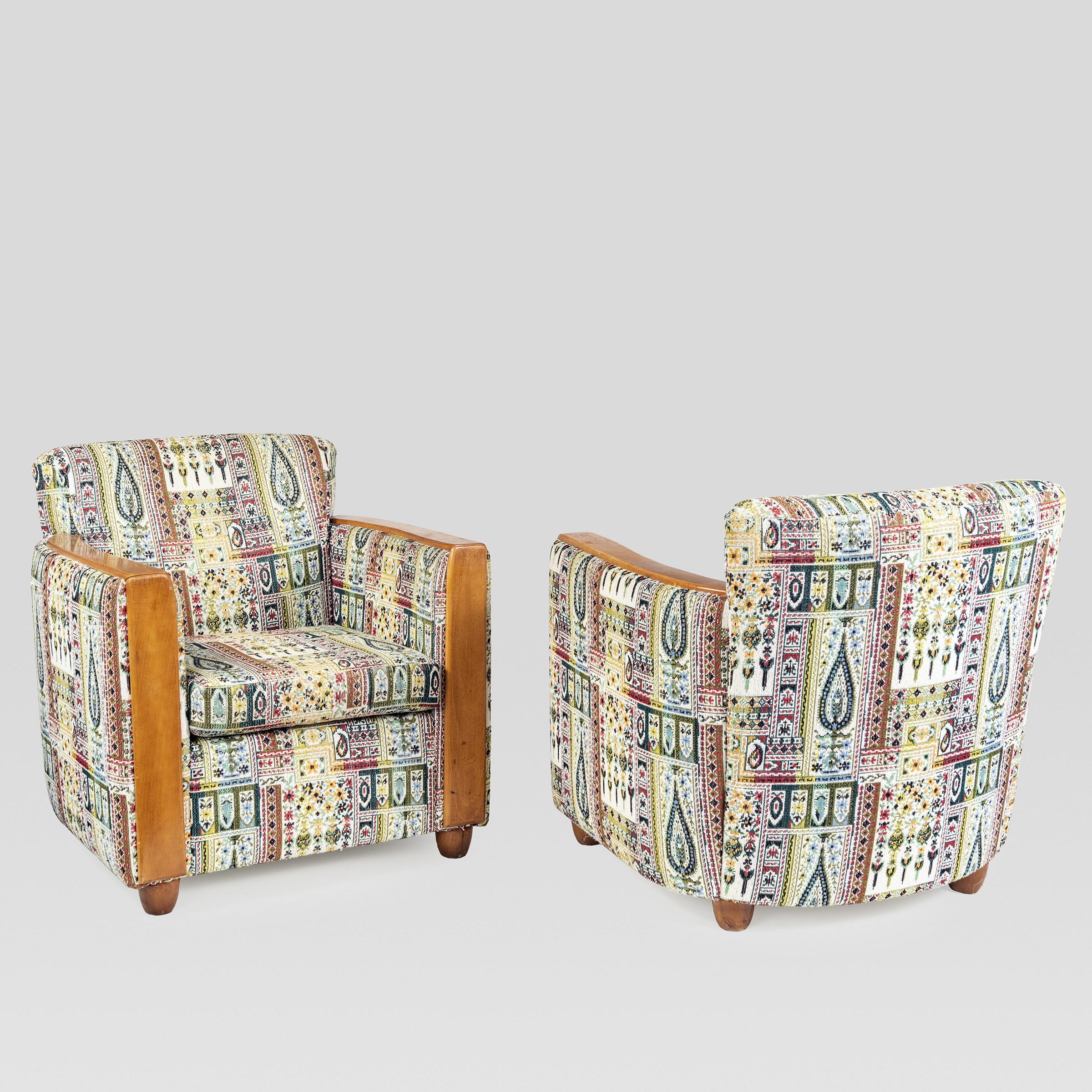 anni 40-50 coppia di poltrone in legno e tessuto imbottito