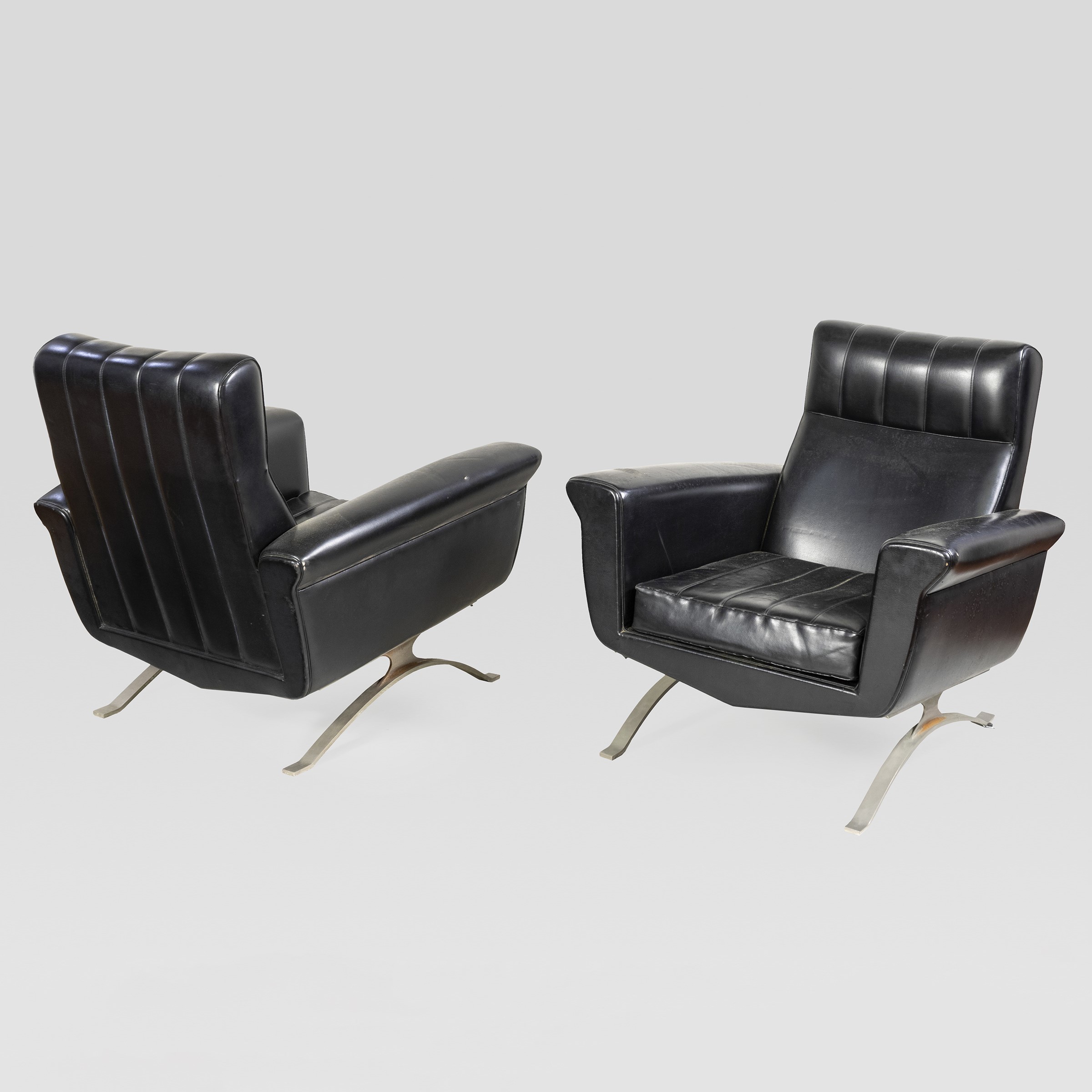anni 60-70 coppia di poltrone in acciaio e similpelle imbottita, lievi usure
