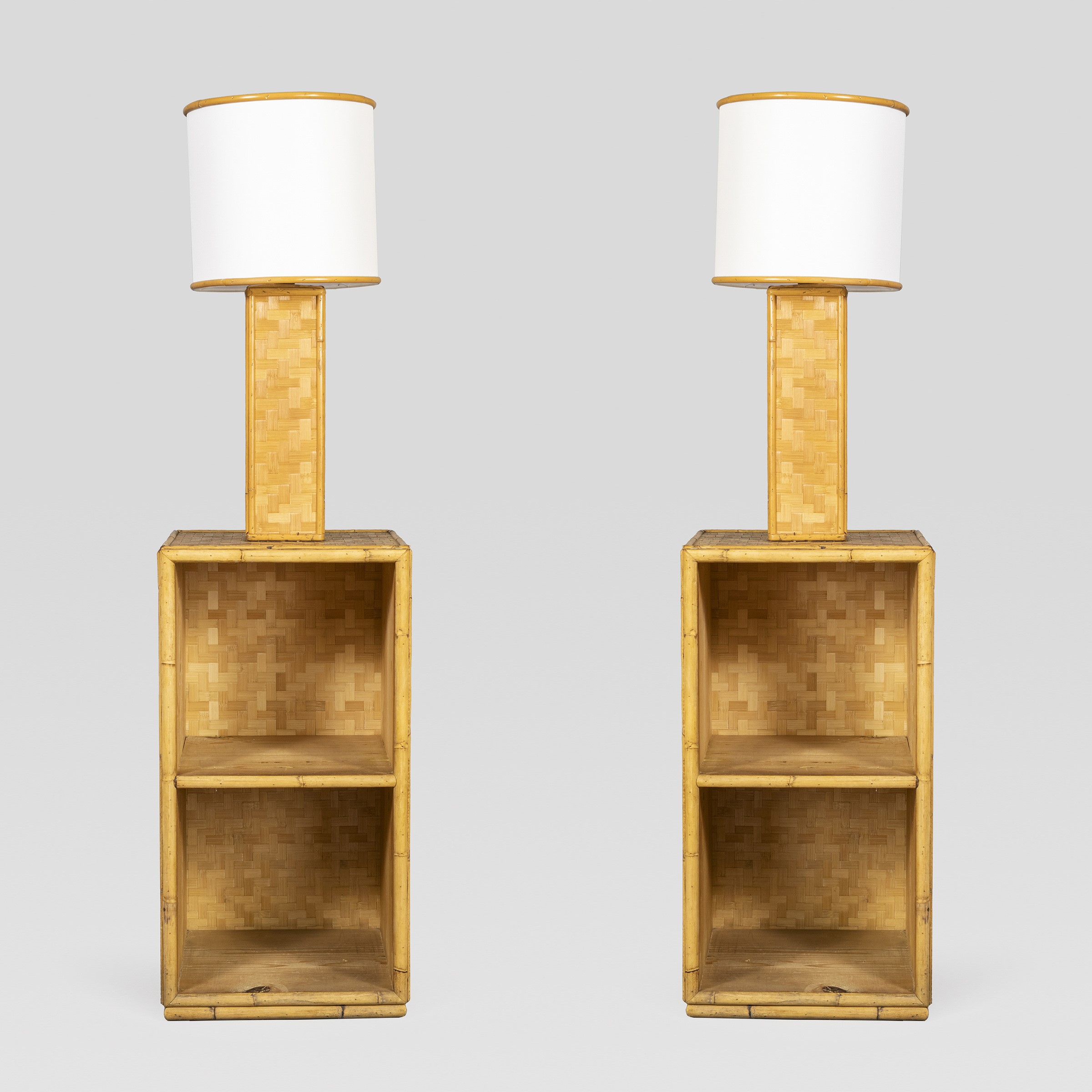 anni 70 coppia di comodini con lampade incorporate in bambù e rattan, completi di paralumi