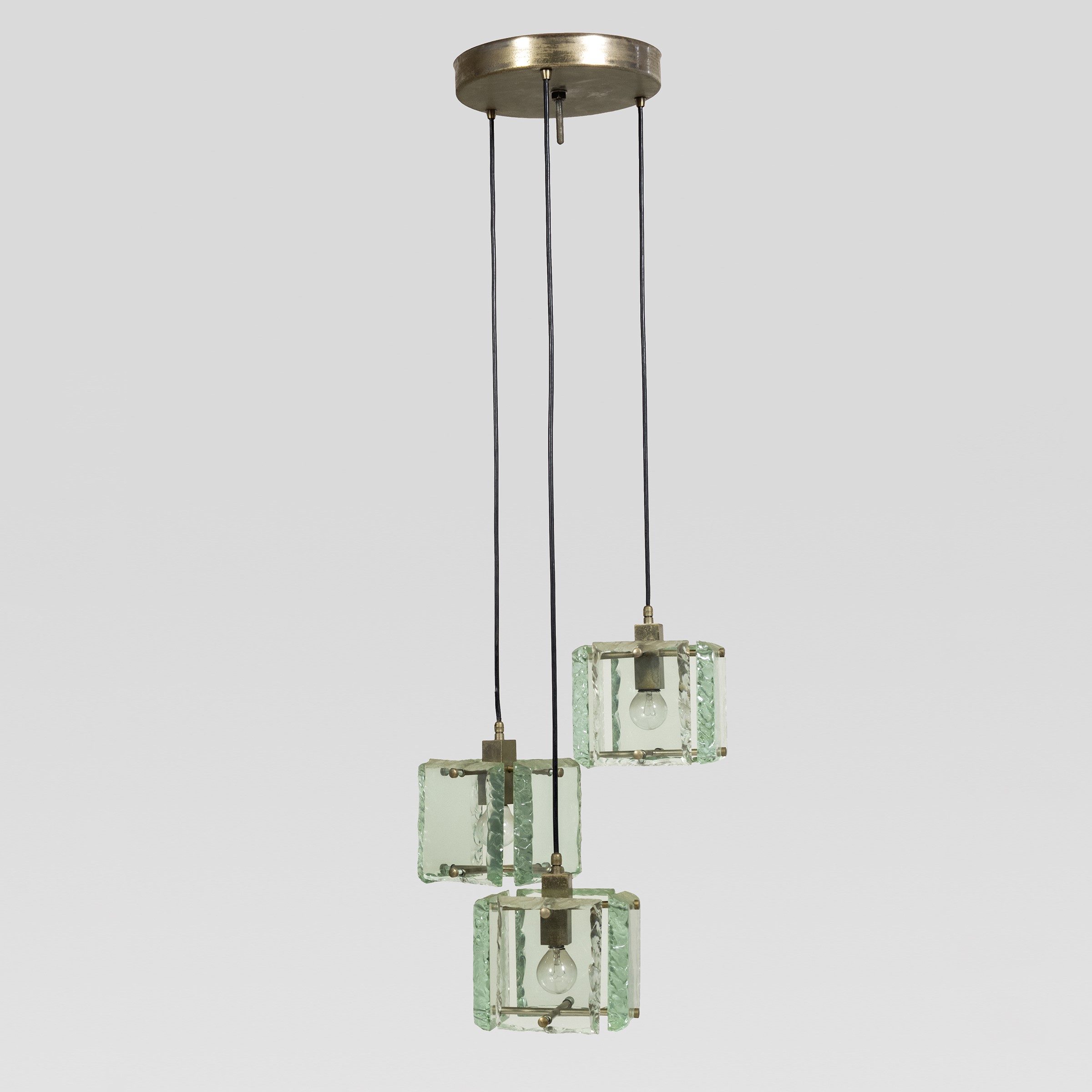 anni 60 lampada a sospensione in metallo con tre diffusori in vetro di forte spessore