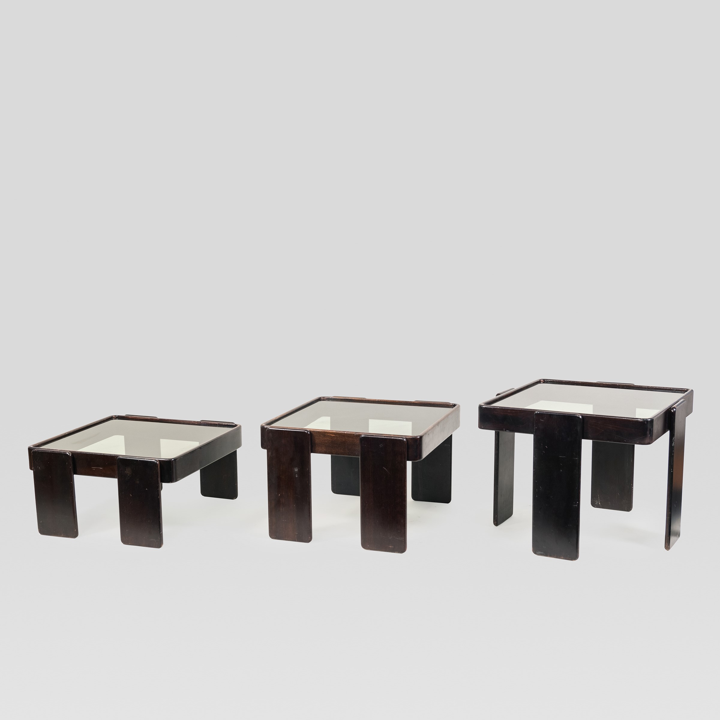 Italia, anni 70 tre tavolini a nido in legno e vetro