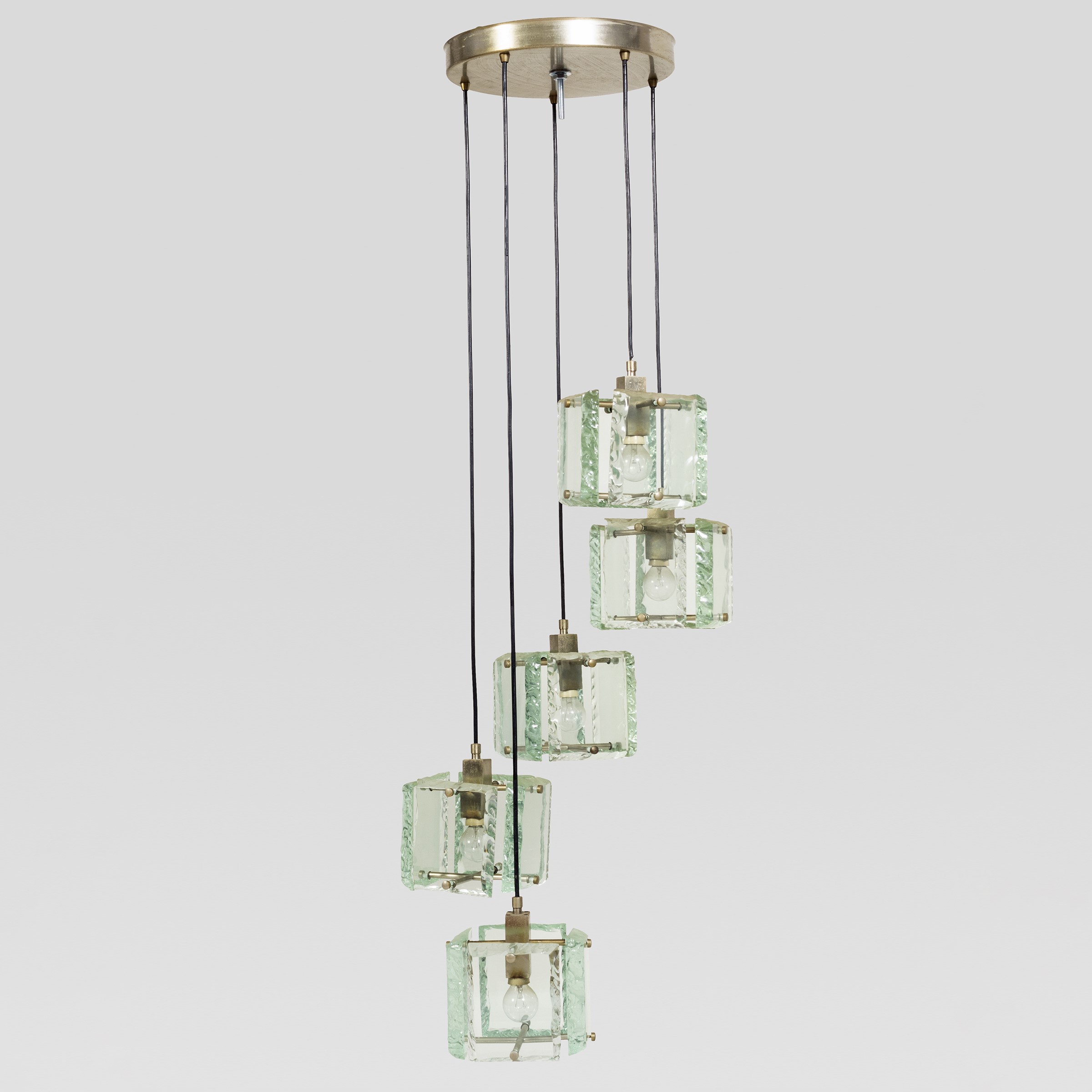 anni 60 lampada a sospensione in metallo con cinque diffusori in vetro di forte spessore