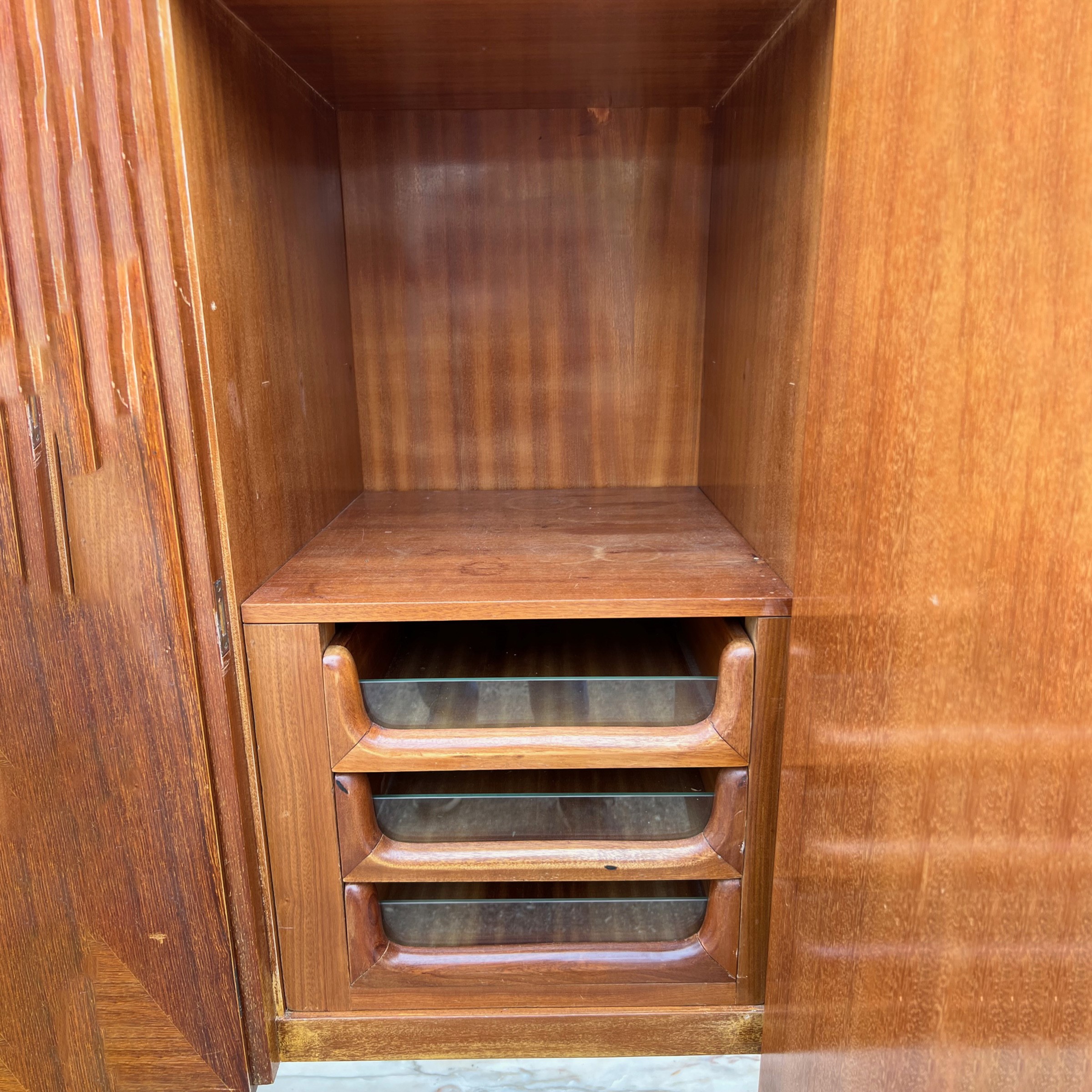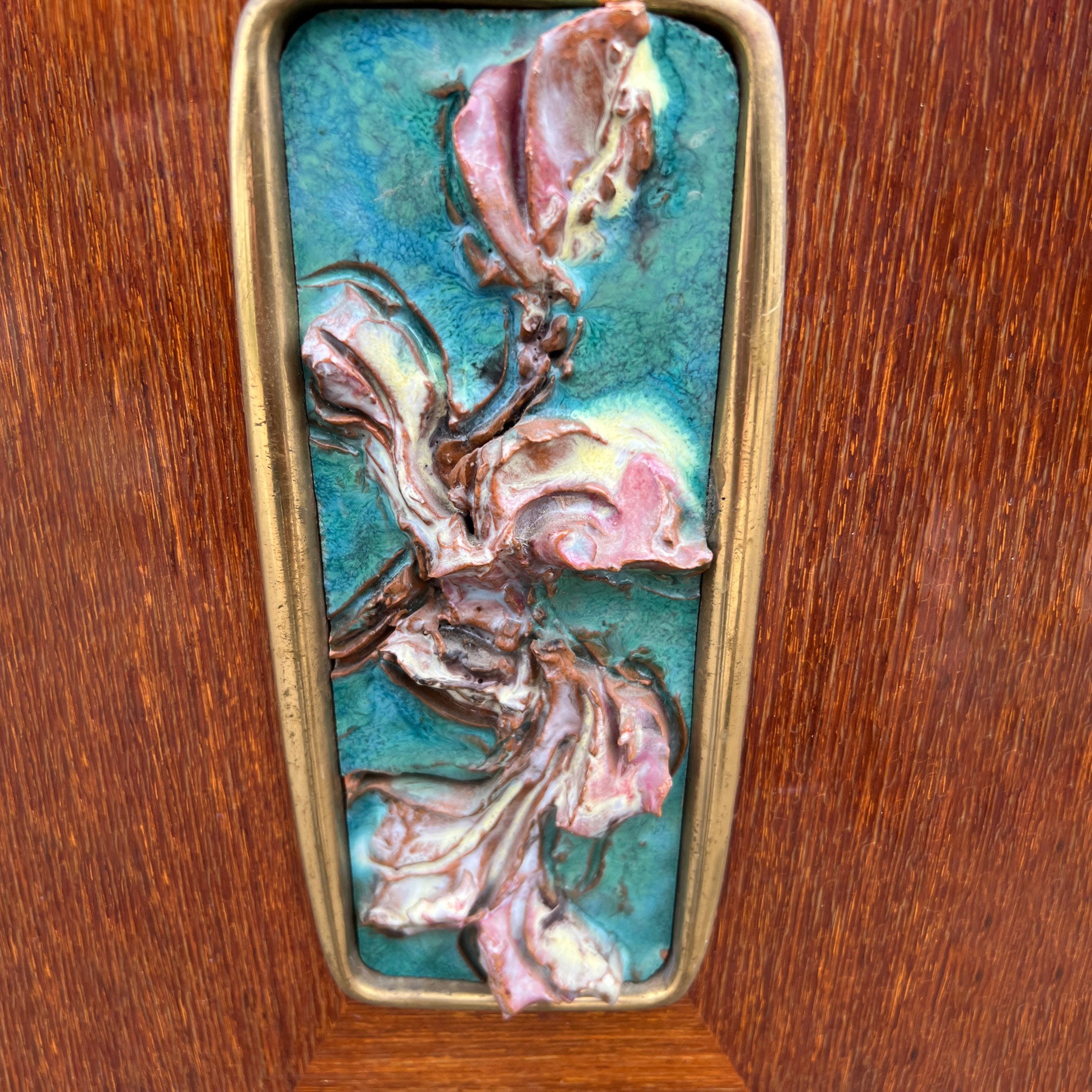 anni 50 mobile credenza in legno, ottone e placche in porcellana policroma