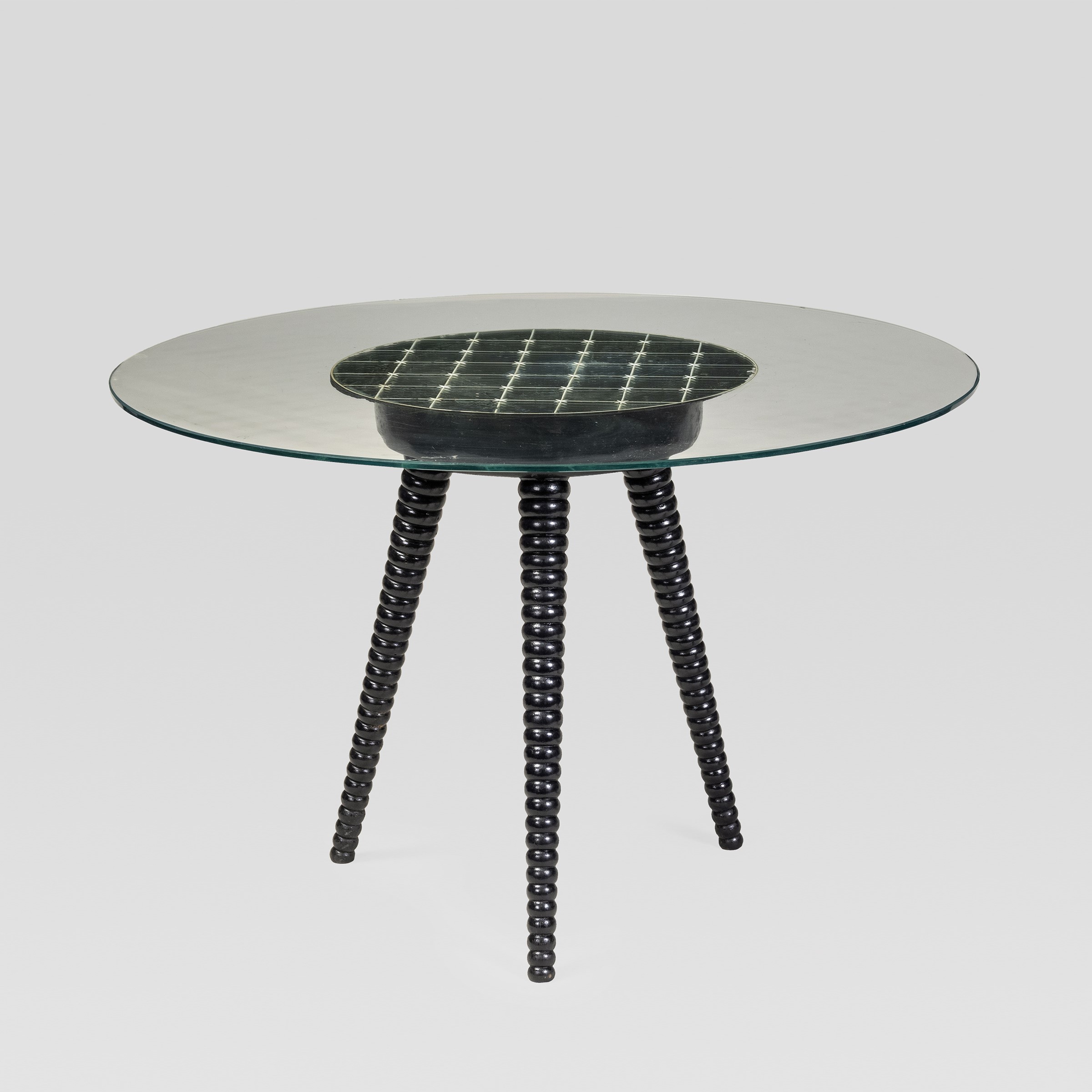 anni 50 tavolino basso in legno, piano circolare in vetro trasparente e specchiato, usure