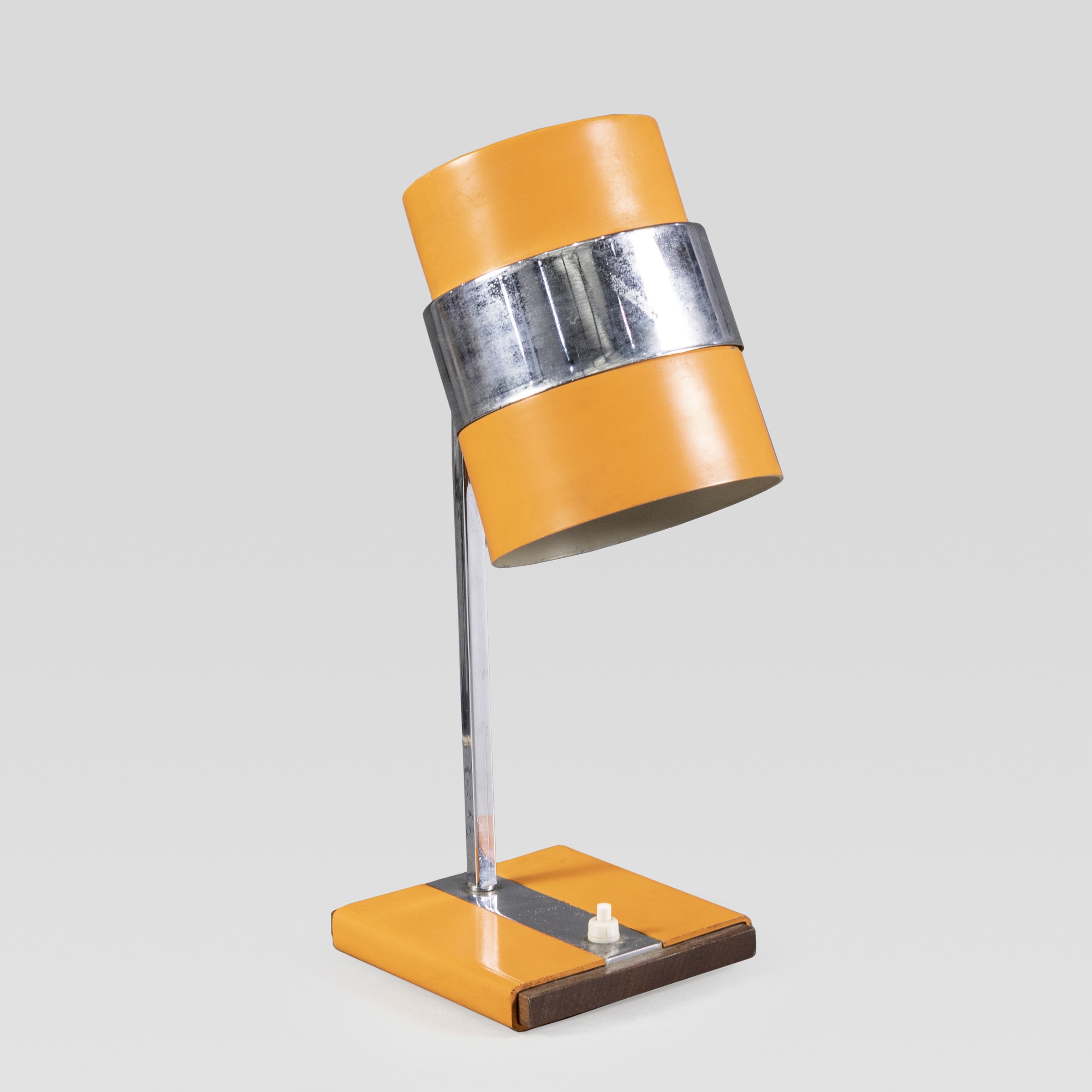 anni 70 lampada da tavolo orientabile in metallo verniciato, acciaio cromato e legno, usure