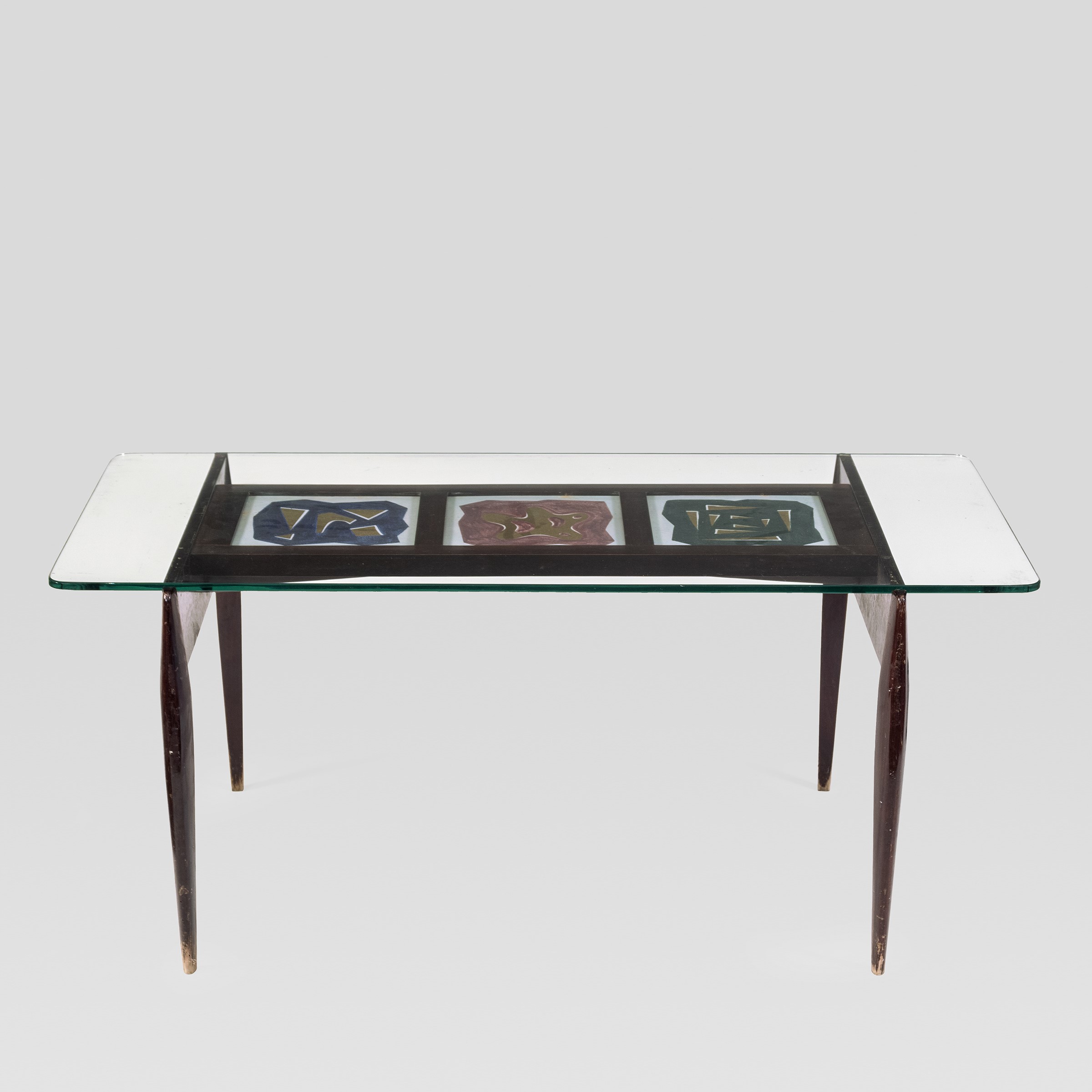 anni 60 tavolino in legno, ceramica dipinta e vetro, lievi usure