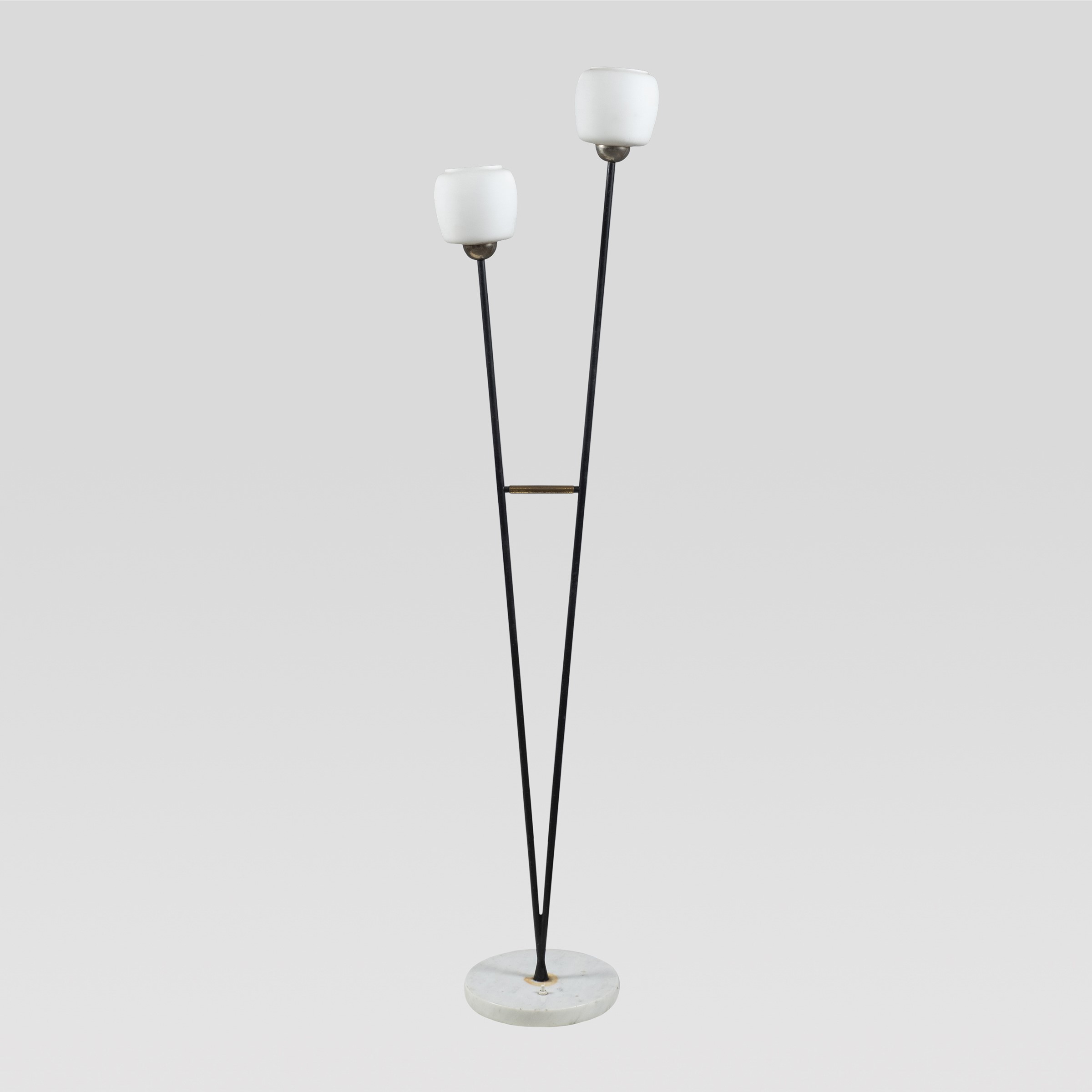 anni 50 lampada da terra in metallo verniciato, ottone, diffusori in vetro opalino e base in marmo