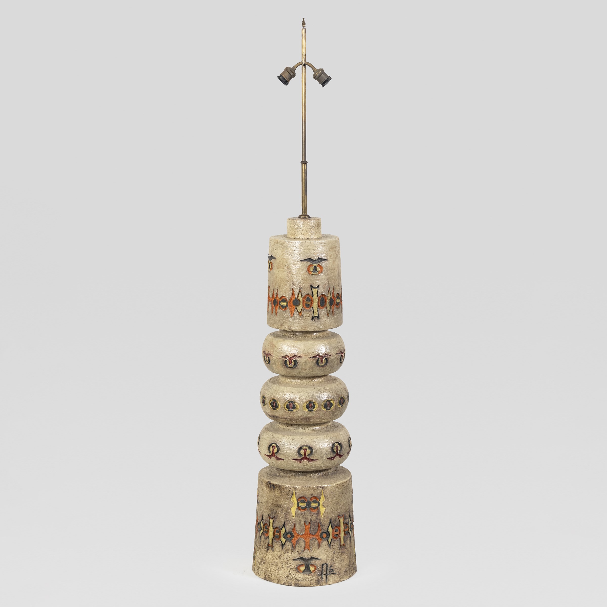 anni 50-60 lampada da terra Totem in ceramica policroma ed ottone, siglata A.S.