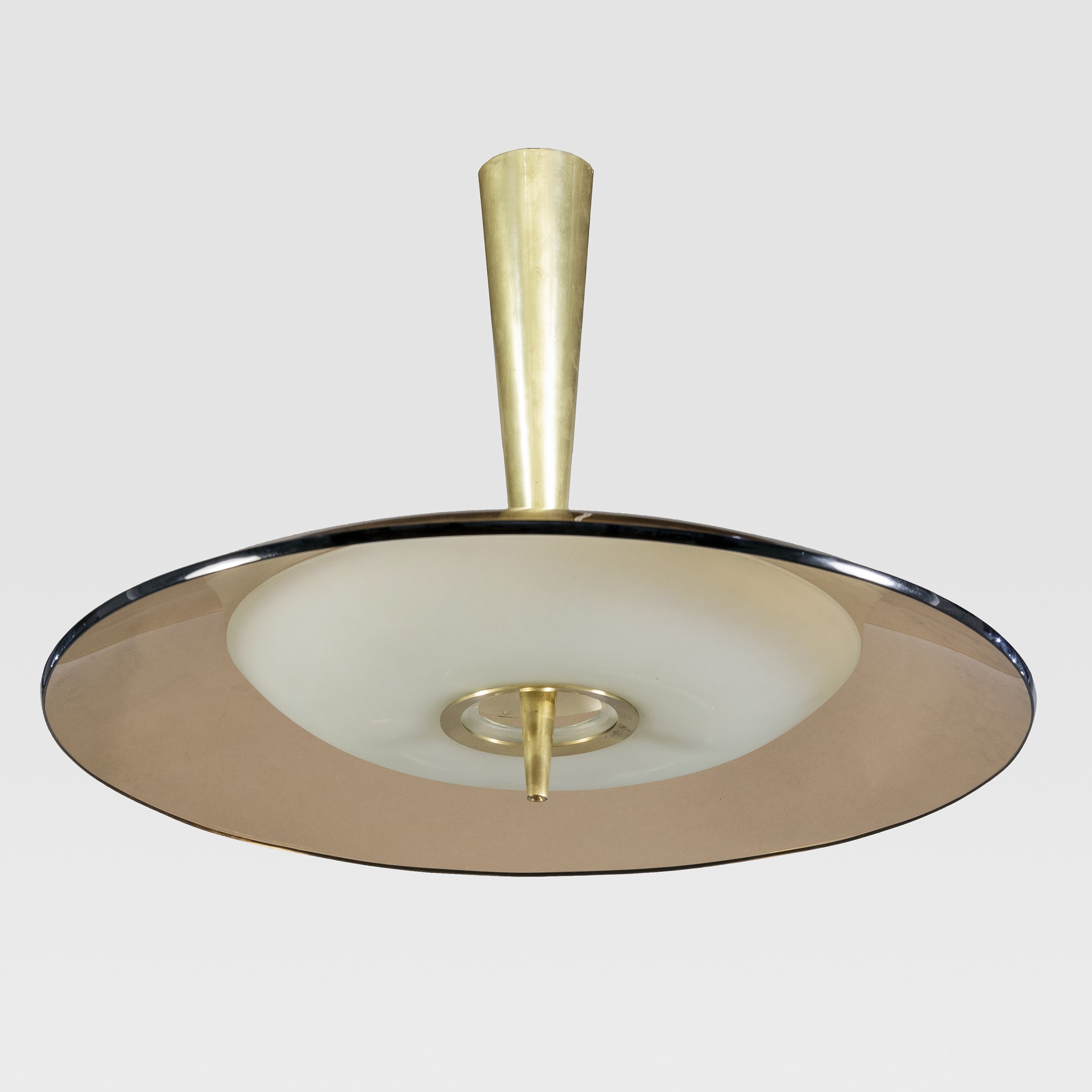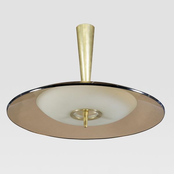 Italia, anni 60 lampada a sospensione, struttura in ottone, diffusore superiore in cristallo colorato curvato, diffusore inferiore in cristallo curvato satinato.