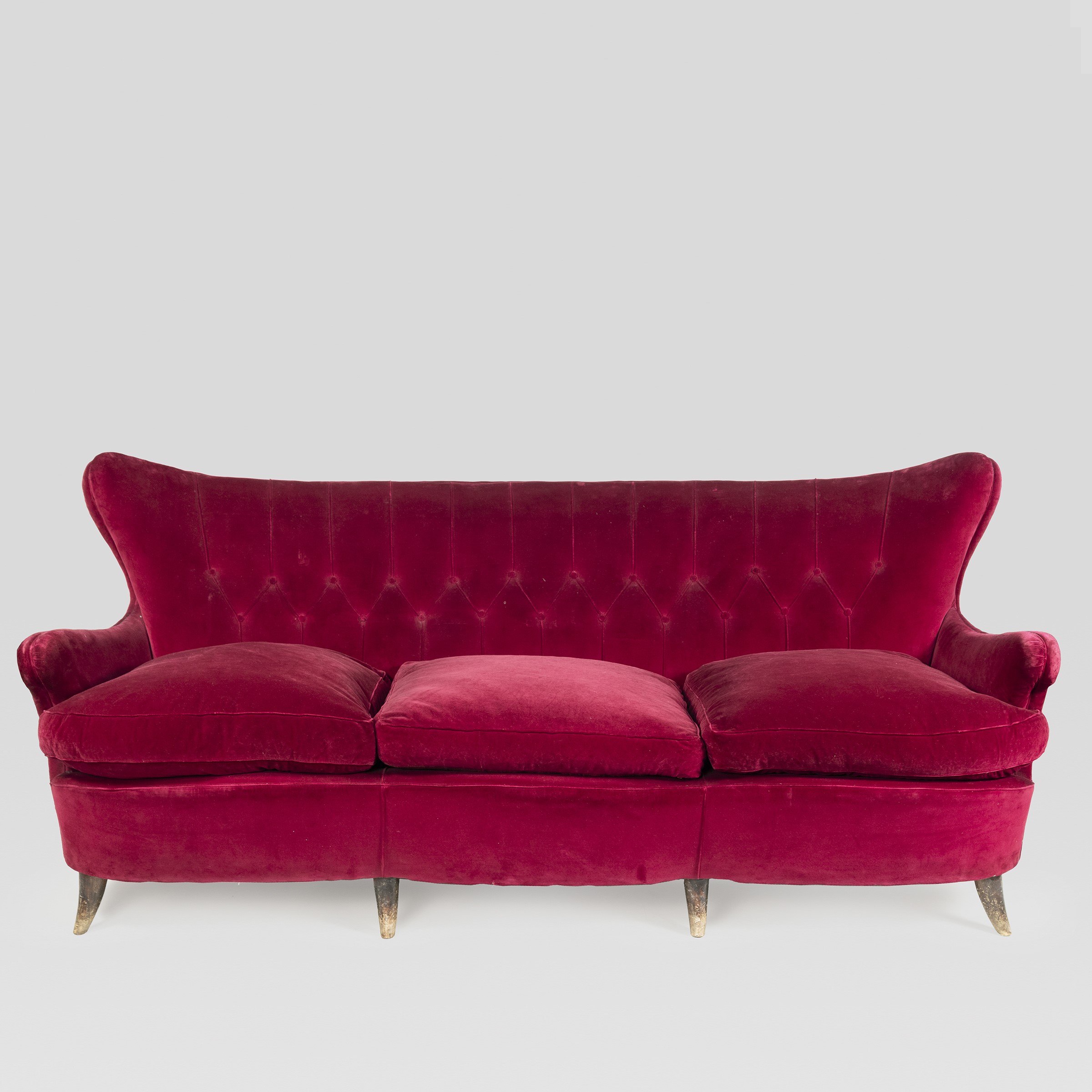 Italia, anni 50 divano in legno e tessuto imbottito, usure