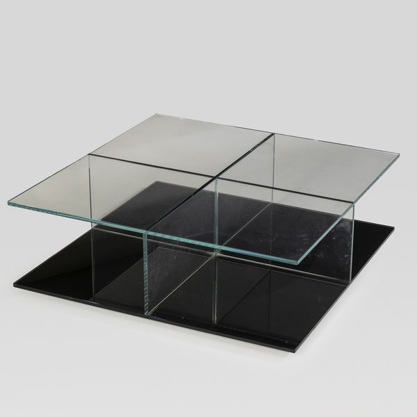 Italia, anni 80-90 tavolino basso mod. Mex 269 in vetro trasparente, colorato e metallo verniciato