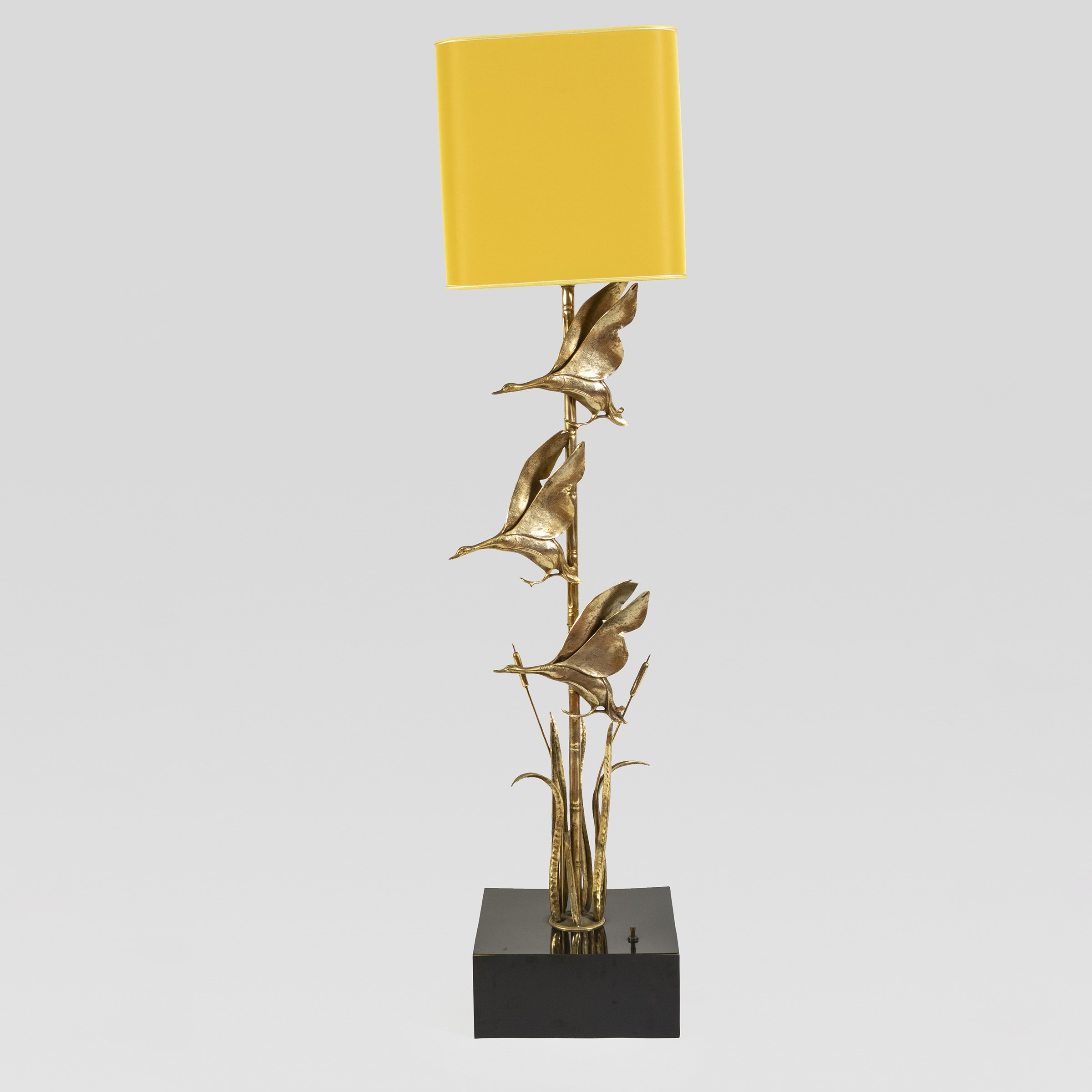 Italia, 70 lampada da terra con anatre in ottone e base laminata, paralume in tessuto