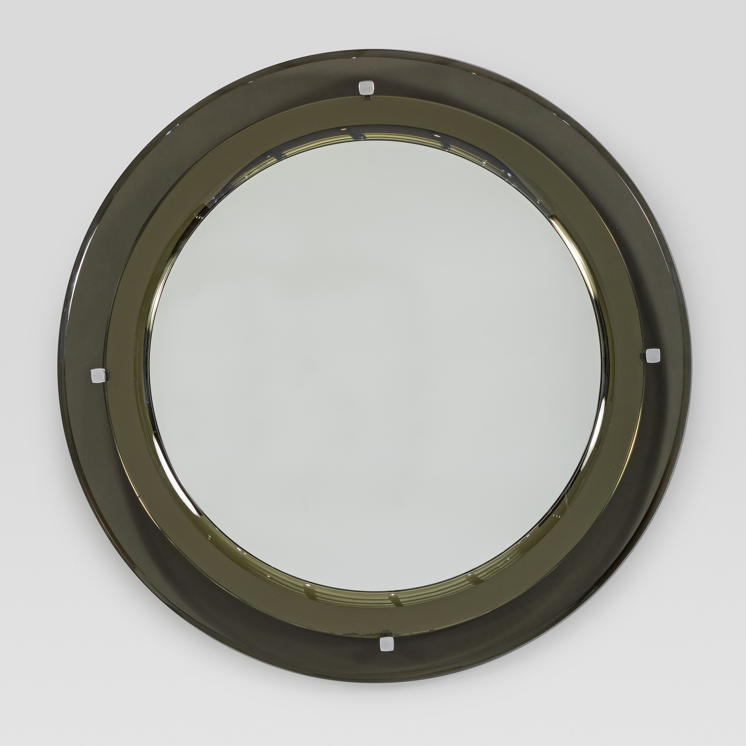 Italia, anni 70 specchio da parete circolare in vetro specchiato e cristallo colorato e molato, etichetta della produzione