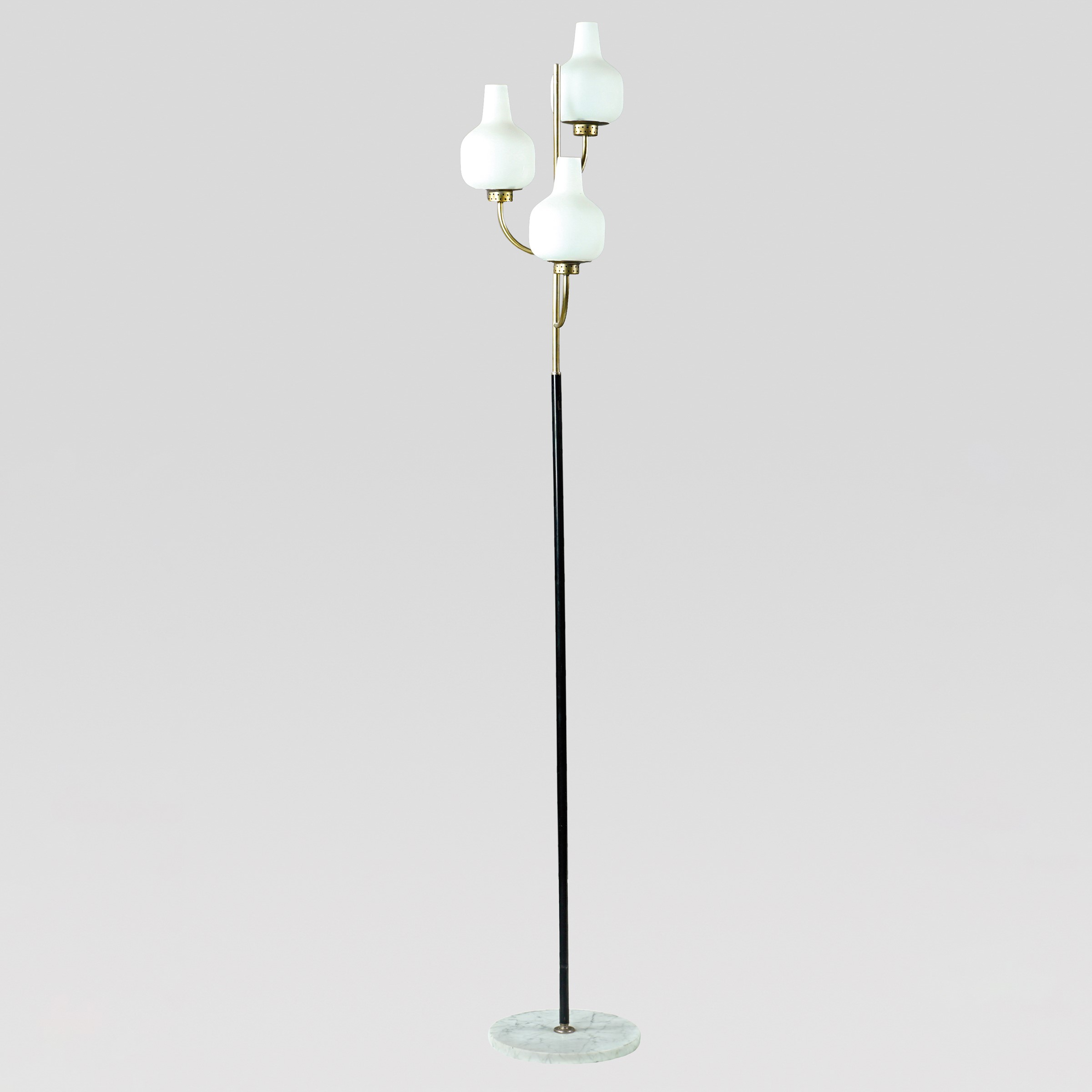 Italia, anni 50 lampada da terra in metallo verniciato, ottone e vetro opalino, base in marmo bianco