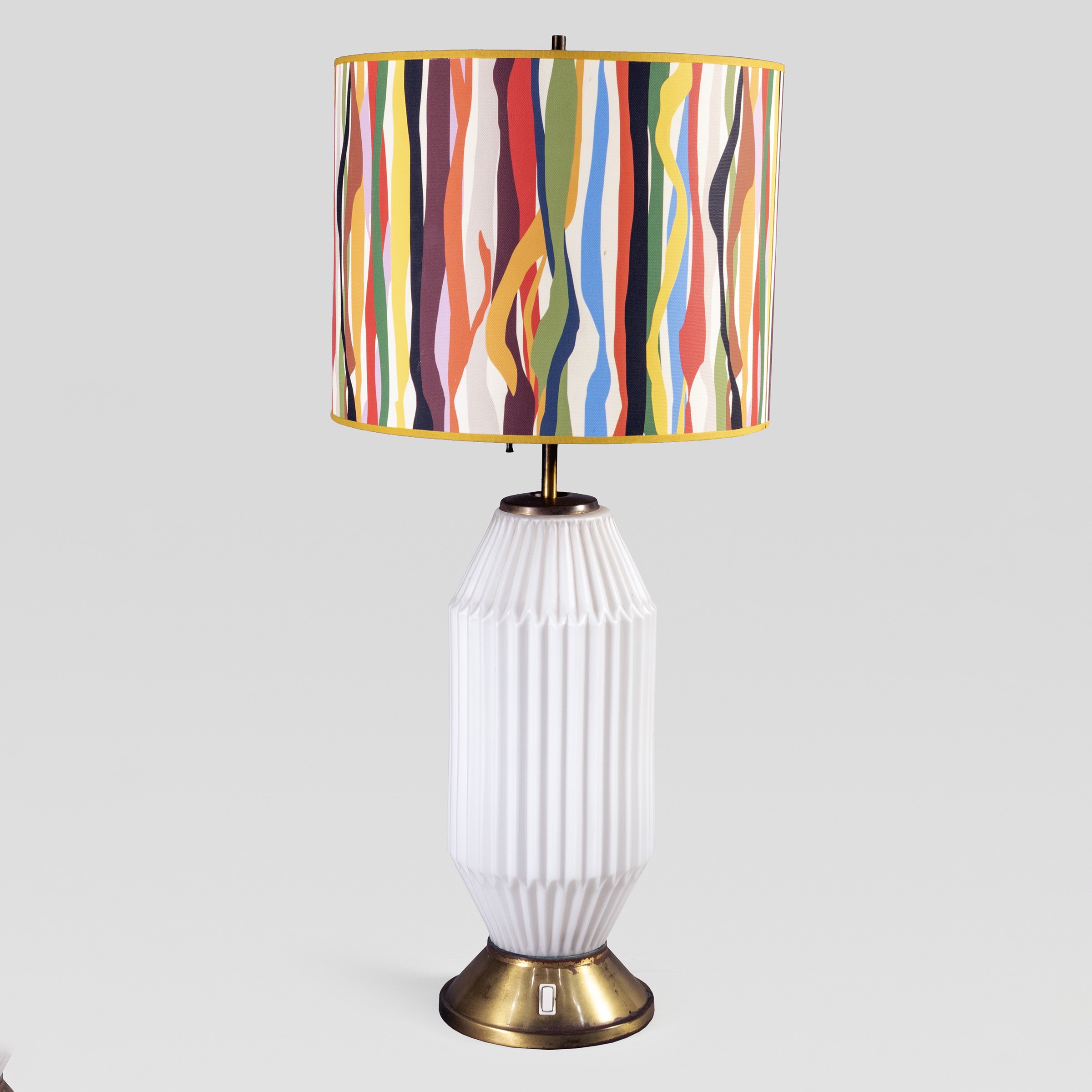 Italia, anni 60 lampada da tavolo in ottone e vetro lattimo, completa di paralume, etichetta della produzione