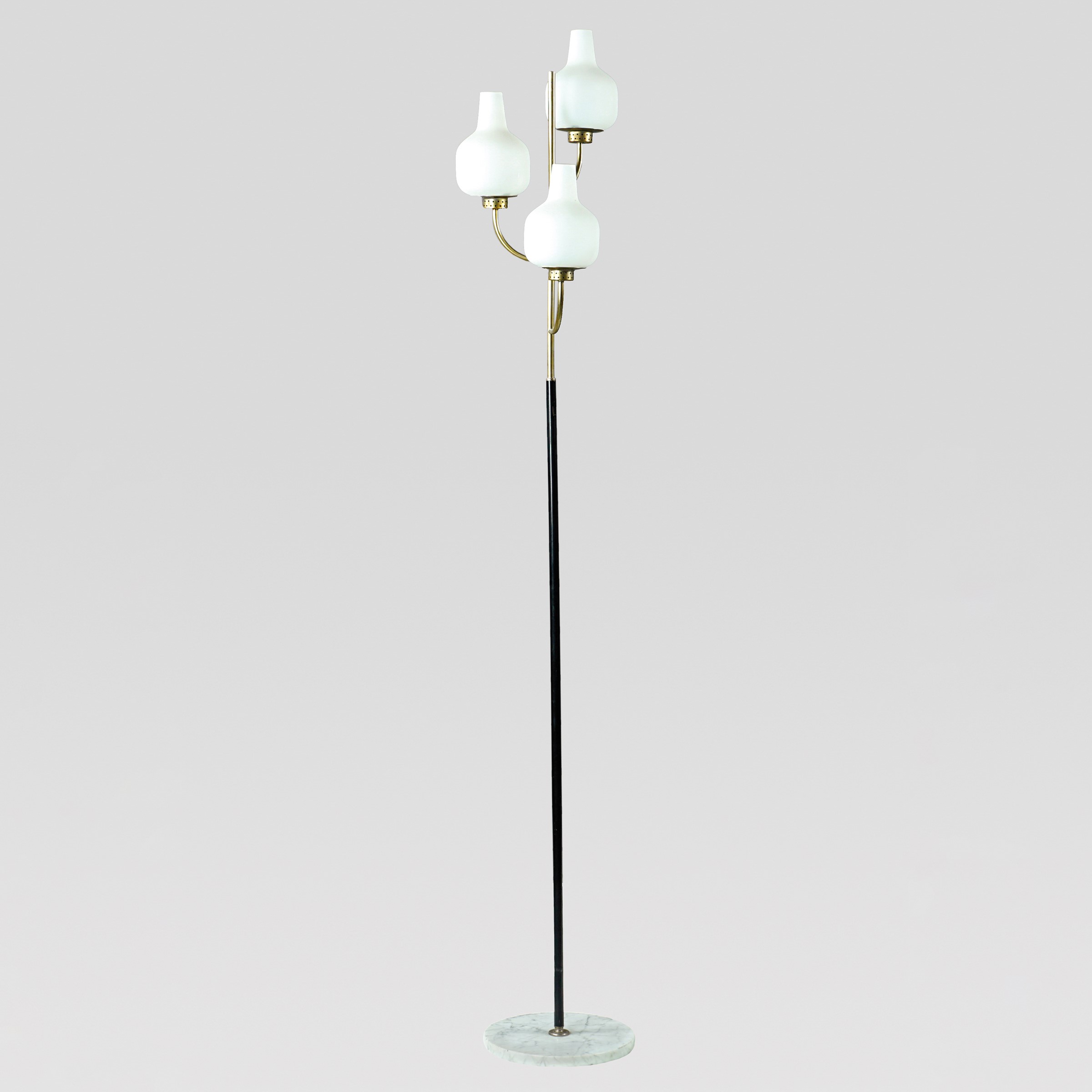 Italia, anni 50 lampada da terra in metallo verniciato, ottone, diffusori in vetro opalino, base in marmo bianco