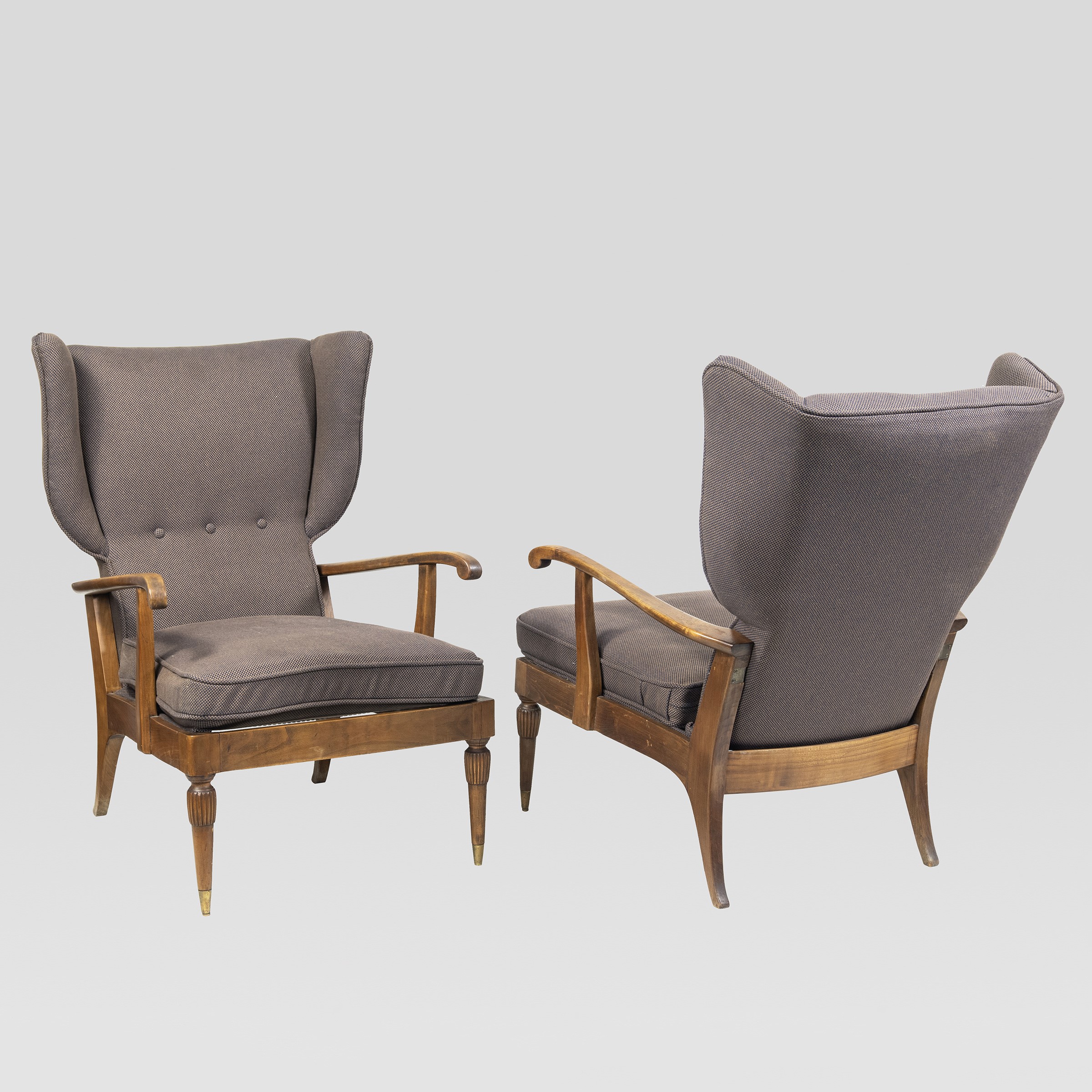 Italia, anni 50 coppia di poltrone reclinabili mod. Camea in legno, tessuto imbottito ed ottone , marchio della produzione
