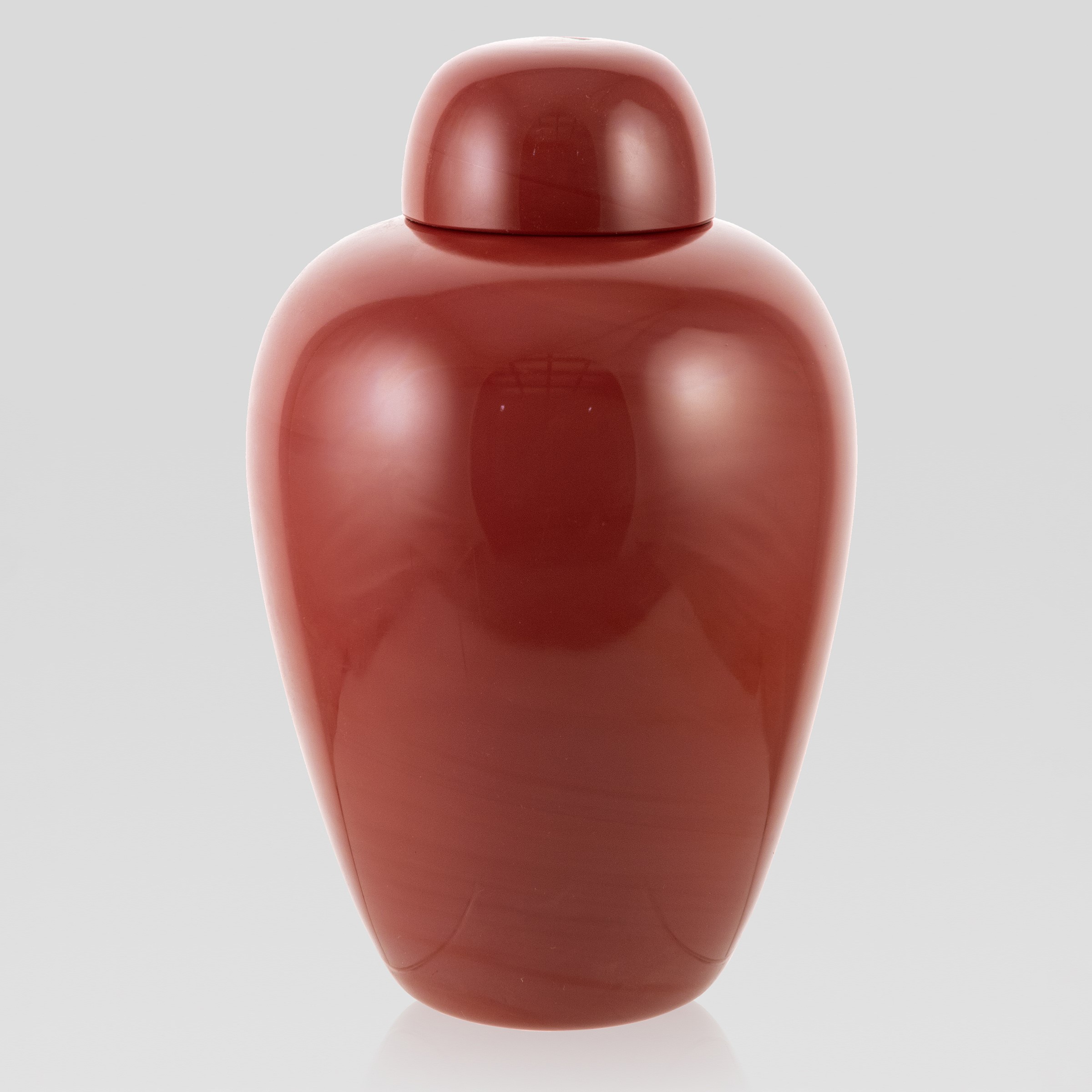 Murano, 1980 vaso con coperchio della serie Opachi in vetro soffiato opalino corallo, firma a punta