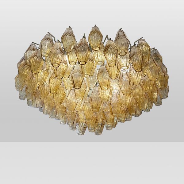Murano, anni 80 lampada a sospensione serie Poliedri in vetro stampato colorato, marchio della produzione.