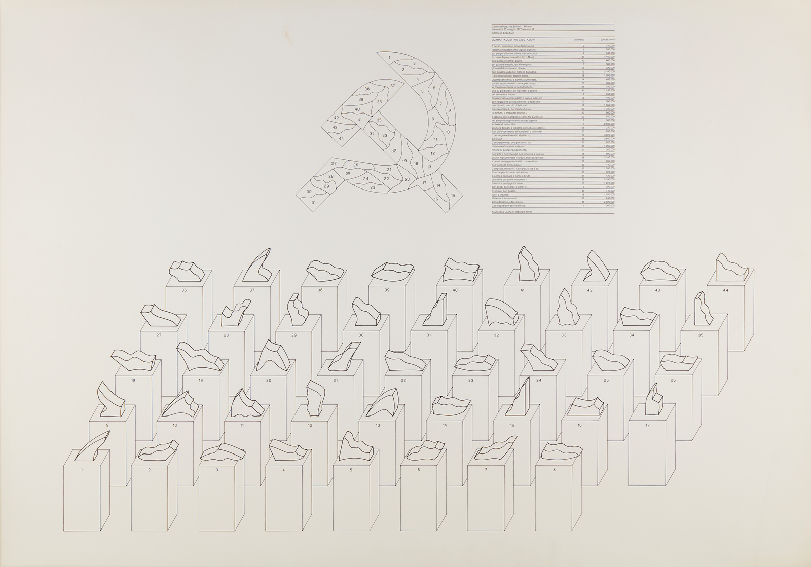 Titolo in alto a destra. Edizione totale: 150 esemplari. Edizione realizzata in occasione della prima mostra della serie di sculture '44 valutazioni', presso la Galleria Plura, Milano, il 25 maggio 1977, esposte poi alla Biennale di Venezia del 1978. Tiratura non presente. Lievi difetti.