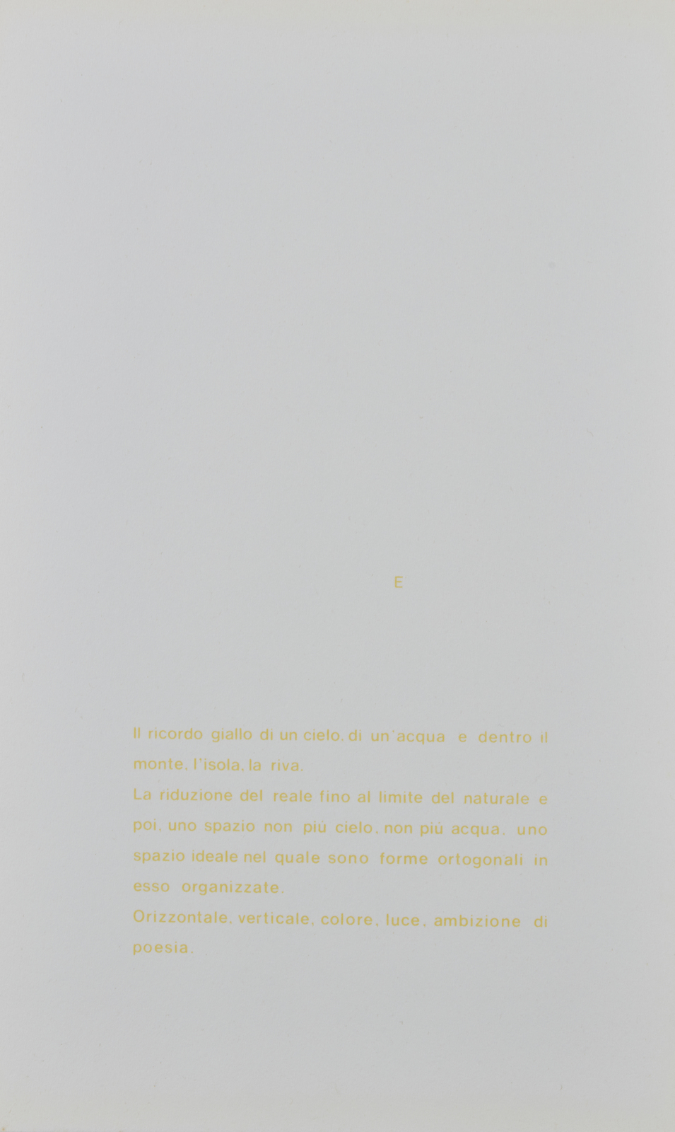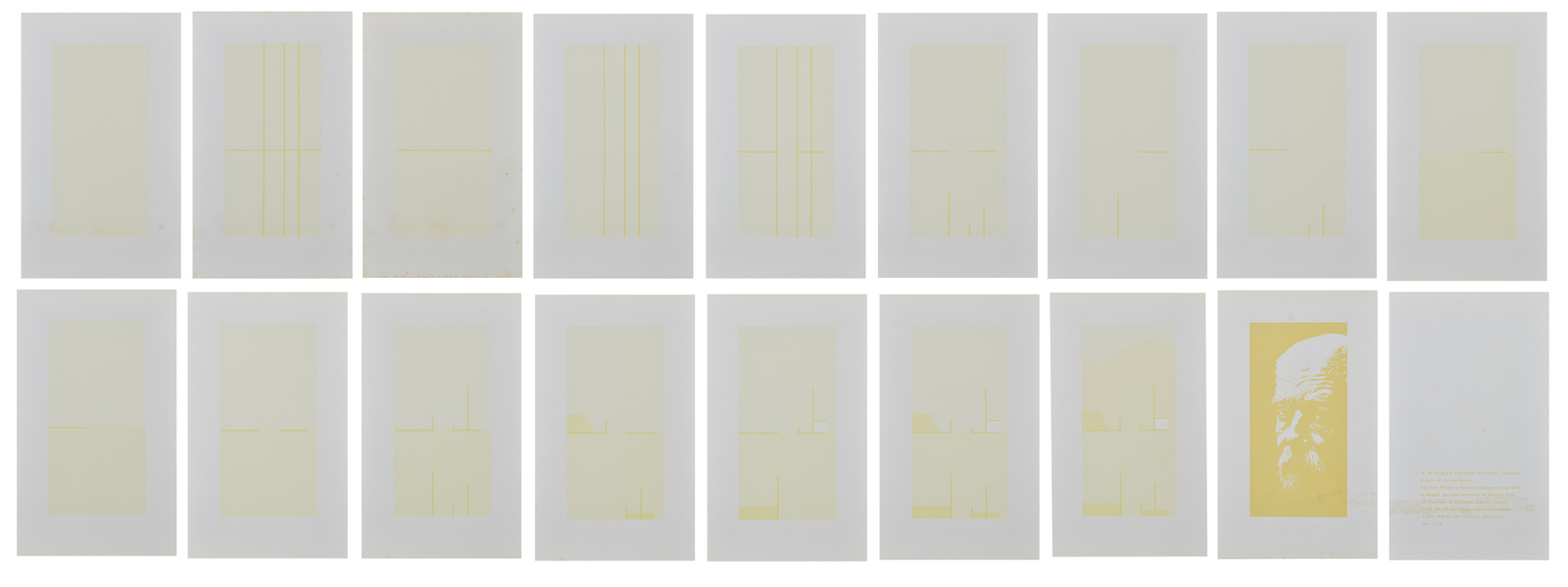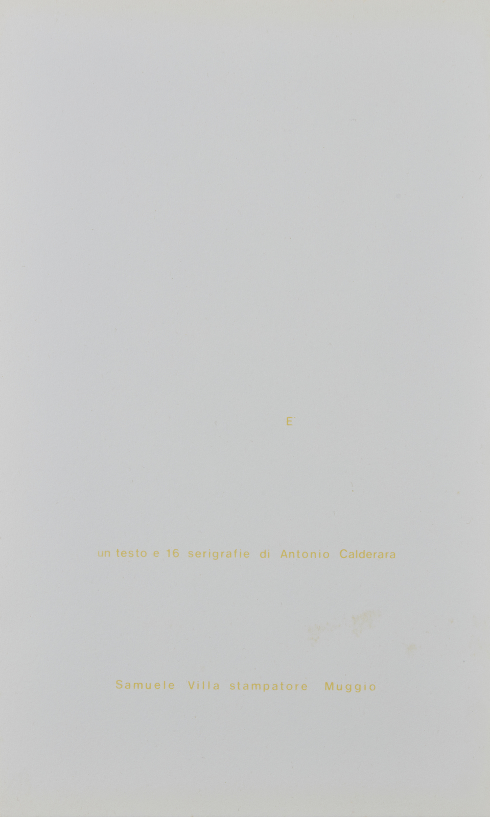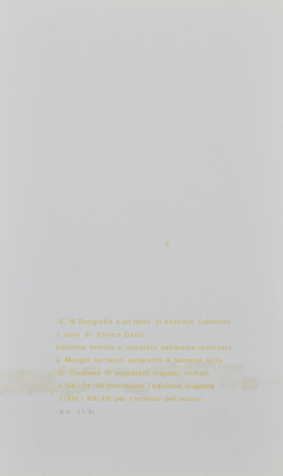 23/54. Al retro di ogni foglio tiratura, firma e anno.Testo e grafiche di Antonio Calderara. Stampatore: Samuele Villa, Muggio. Edizione totale: 54 esemplari numerati da 1/54 a 54/54 + XIII Esemplari per l'archivio dell'autore. Scatola originale. Difetti.