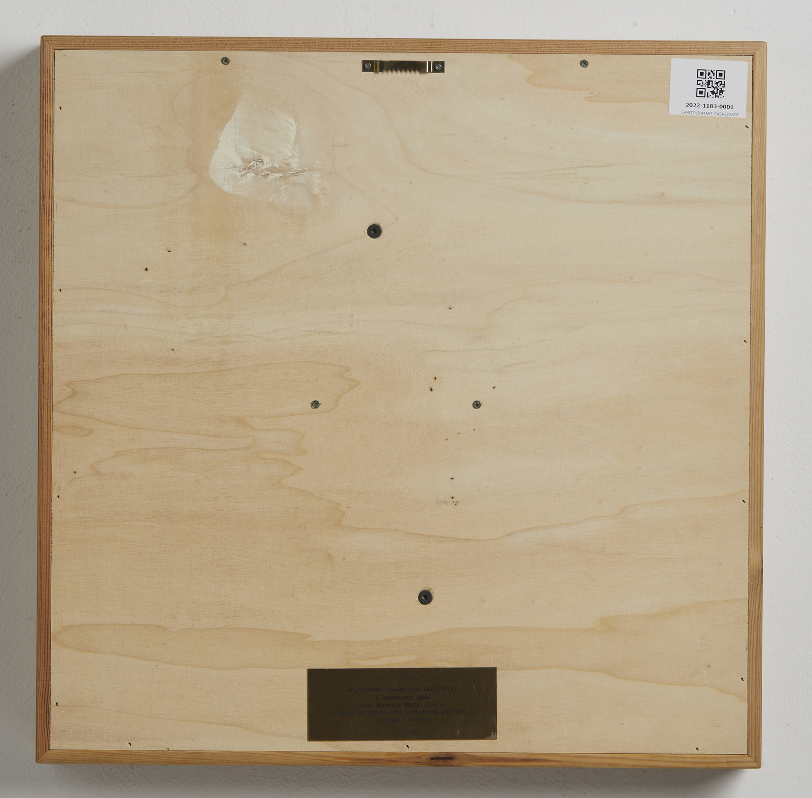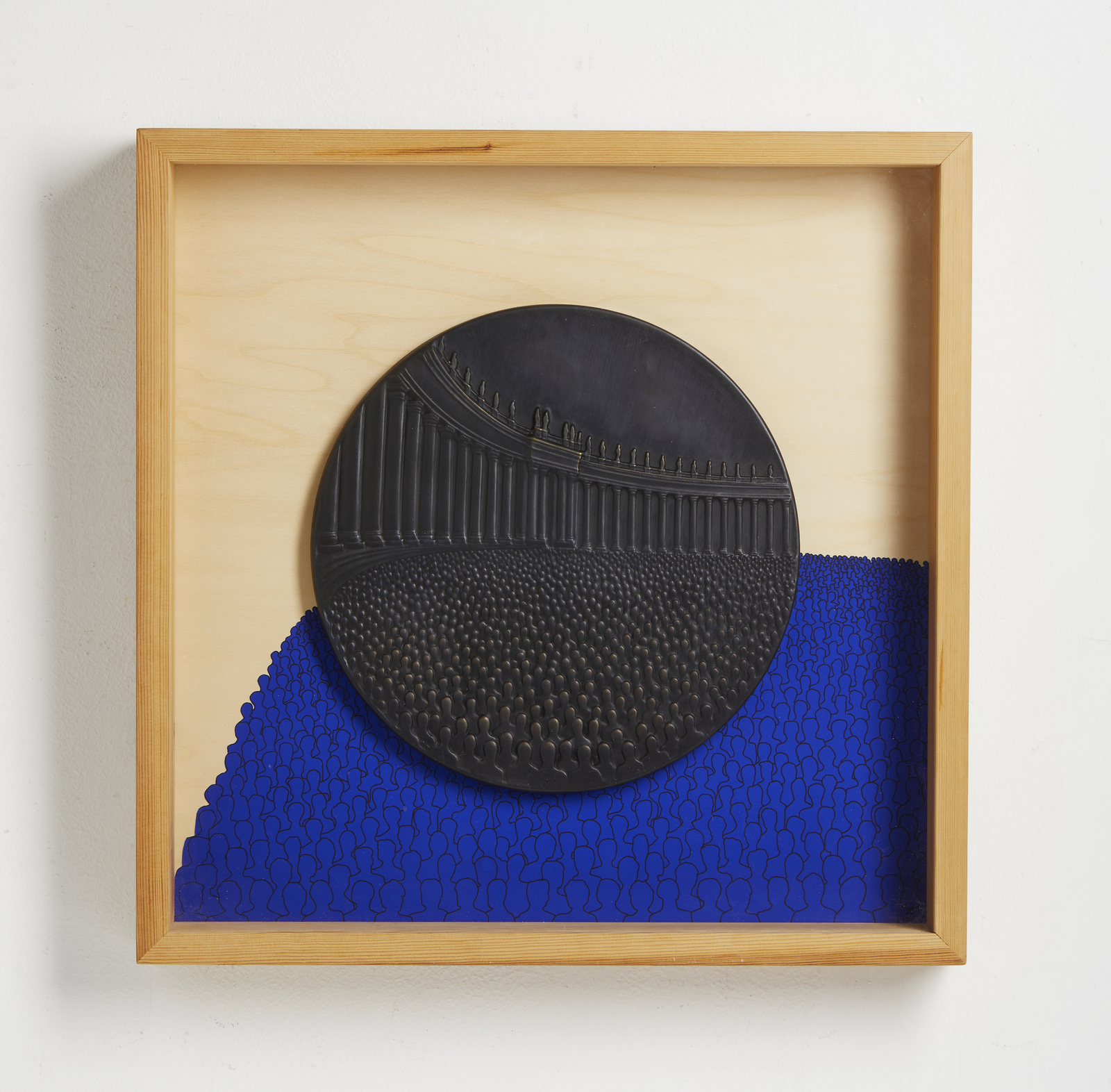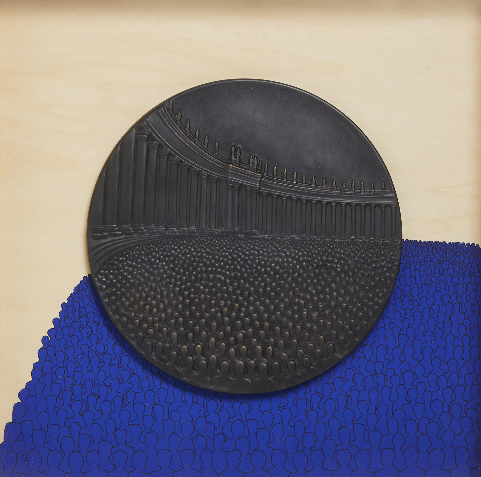 54/350. Tiratura e firma incise in basso. Diametro bassorilievo: 30 cm.Edizione totale: 350 + XXV esemplari. GDE Bertoni, Paderno Dugnano. Fondo in legno realizzato in serigrafia presso Stamperia d'Arte l'Incisione, Corbetta. Provenienza: Collezione Cevenini. Collezione privata, Bergamo. Certificato di autenticità e provenienza Art'E', Bologna.