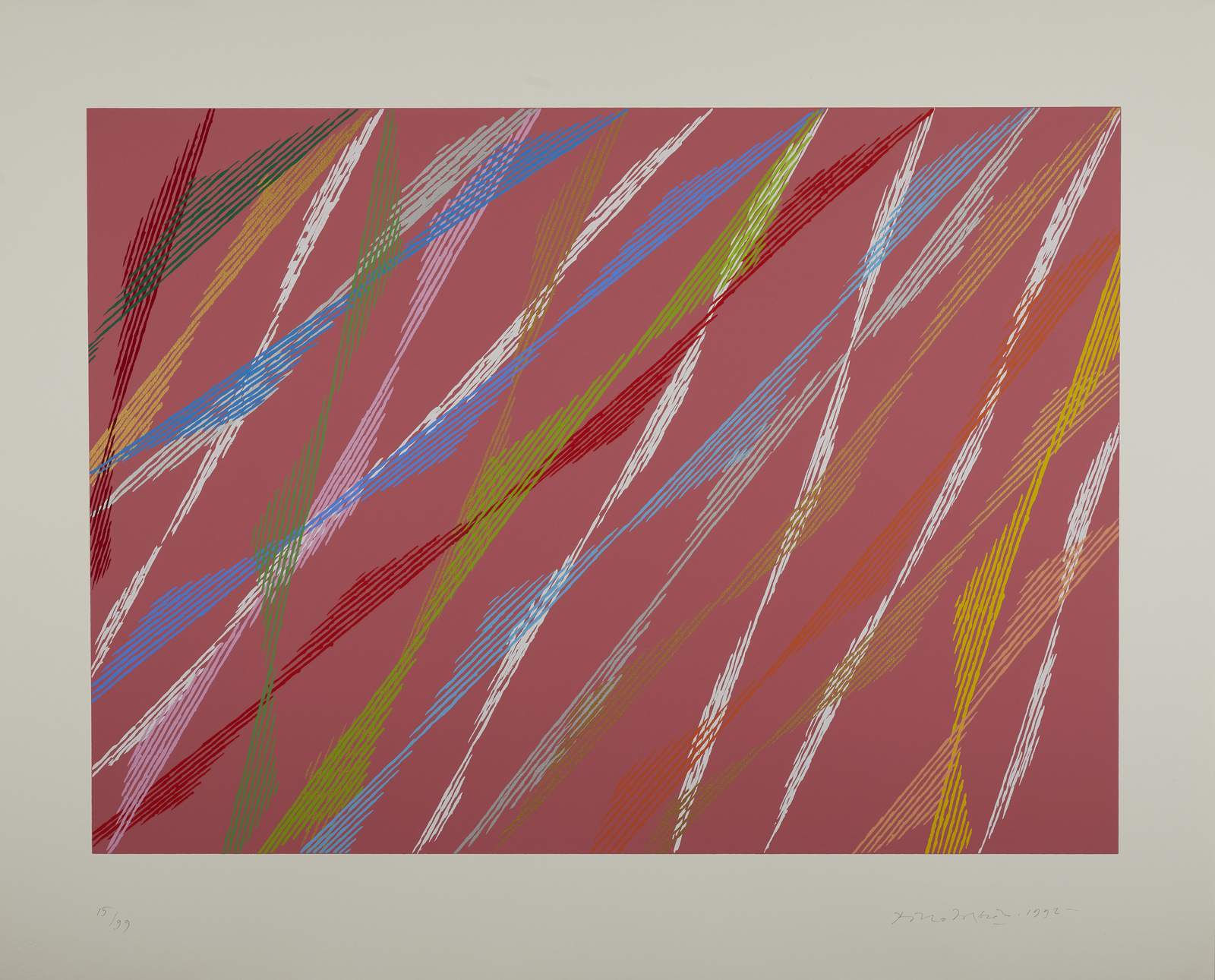 15/99. Tiratura, firma e anno in basso a matita. Edizione totale: 99+XXV esemplari. Timbro a secco Atelier Arcay, Parigi. Stampate per George Fall editore. Cartella non completa.