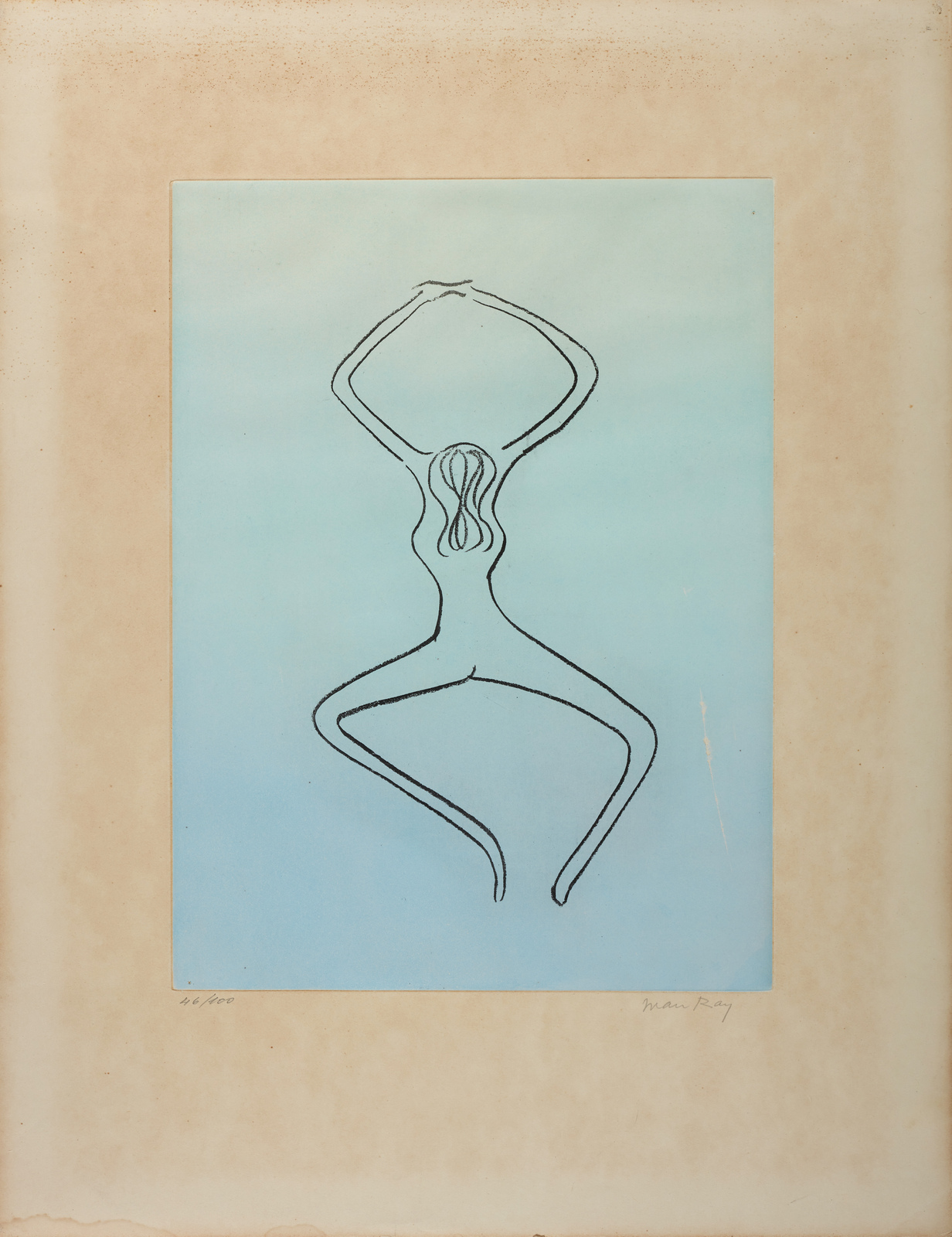 46/100. Tiratura e firma in basso a matita. Dimensione lastra: 42.7x31.7 cm. Foglio proveniente dalla cartella composta da n.11 acquaforti Les anatomes. Edizione totale: 100 esemplari + XXV. Stampatore ed Editore: Georges Visat, Parigi. Pubblicazione: Man Ray Opera Grafica. Luciano Anselmino, Ed. Mondadori 1973. Difetti.