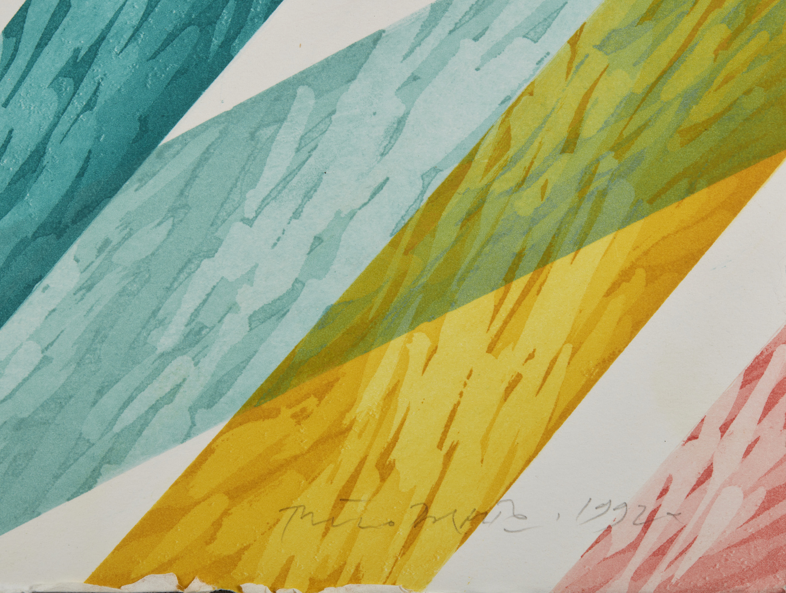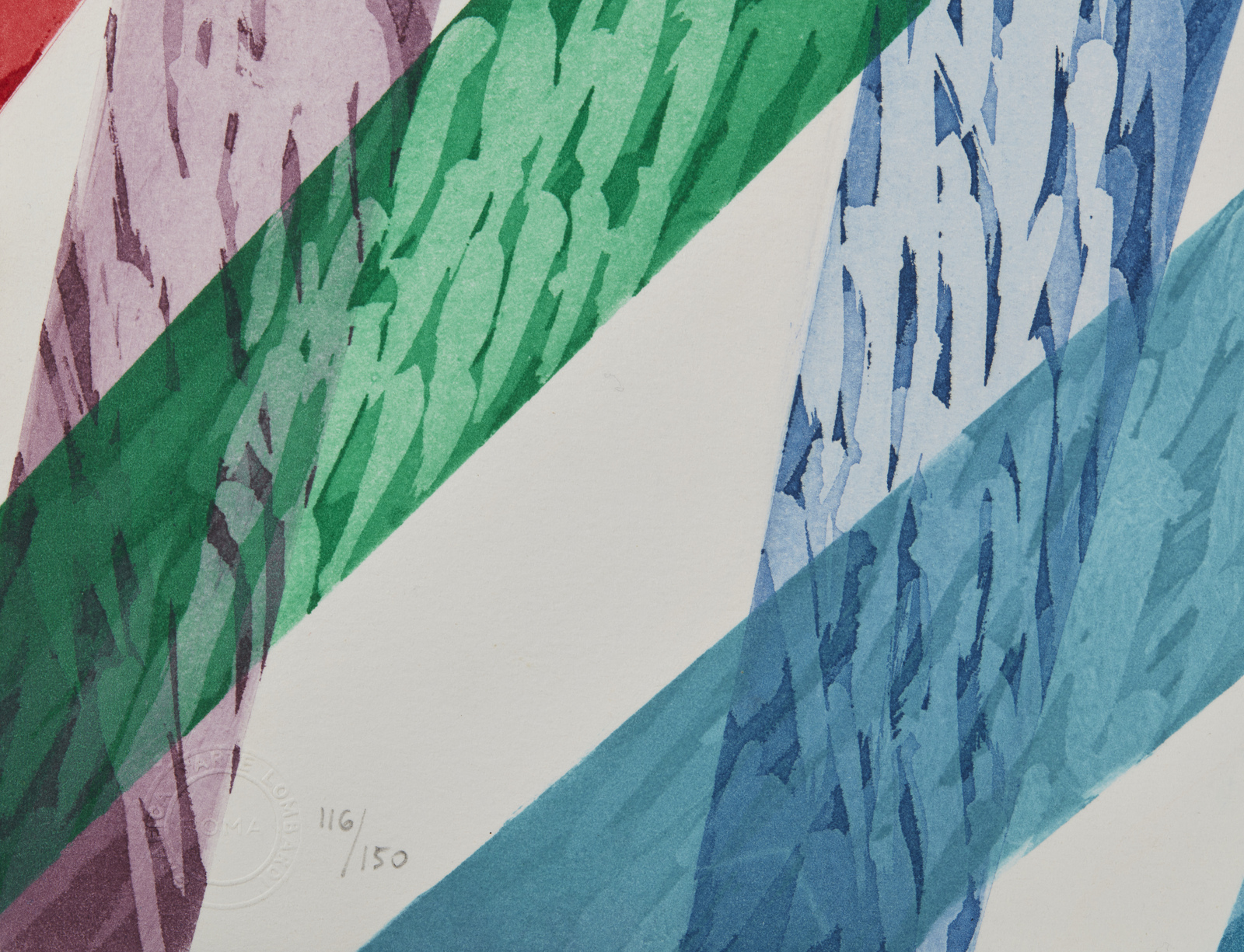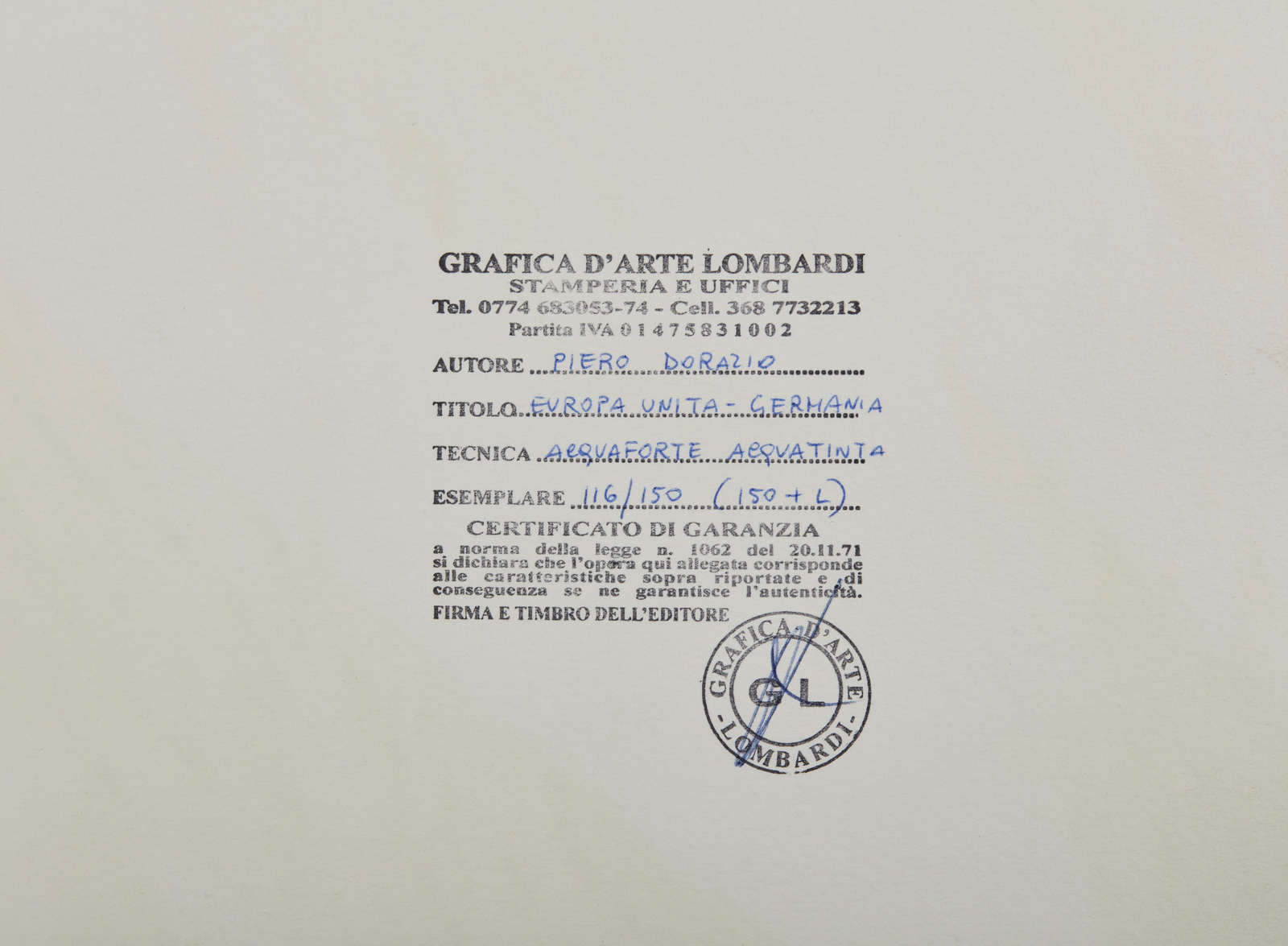 116/150. Tiratura, firma e anno in basso a matita. Timbro a secco Grafica d'Arte Lombardi, Roma, in basso a sinistra. Edizione totale: 150+L esemplari. Dimensione lastra: 58x76 cm. Stampatore: Grafica d'Arte Lombardi, Roma. Pubblicazioni: Piero Dorazio. L'opera incisa (1962-1993), a cura di Gabriele Simongini, Edizioni Pananti, Firenze, 1997.