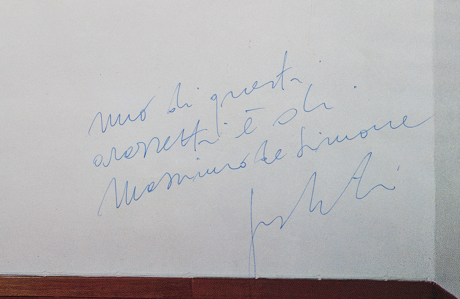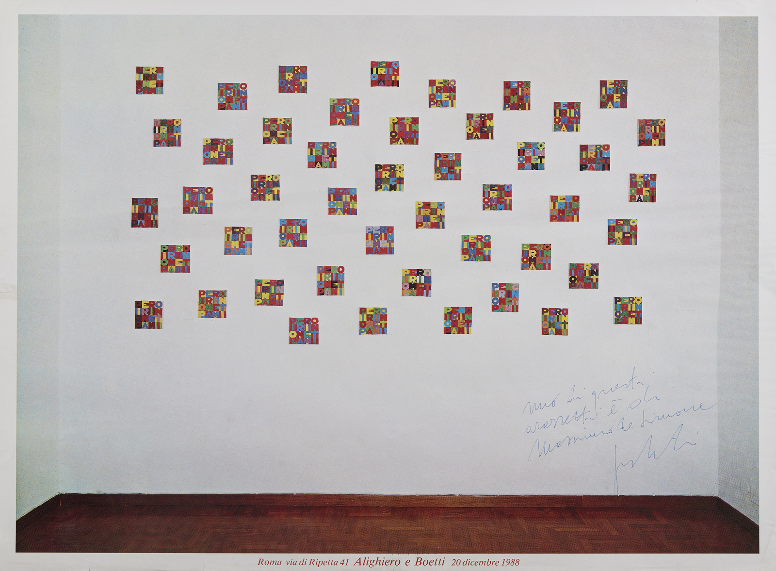 Firma e dedica in basso a destra a penna. Manifesto della performance di Alighiero Boetti effettuata in Via Ripetta 41 a Roma nel 1988. Difetti.