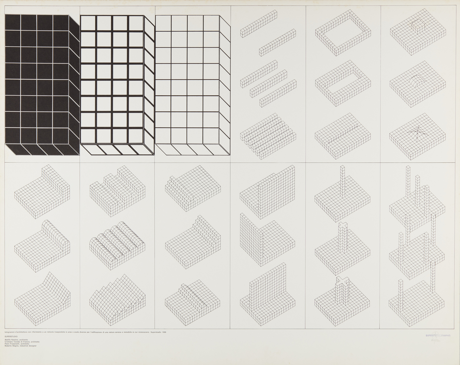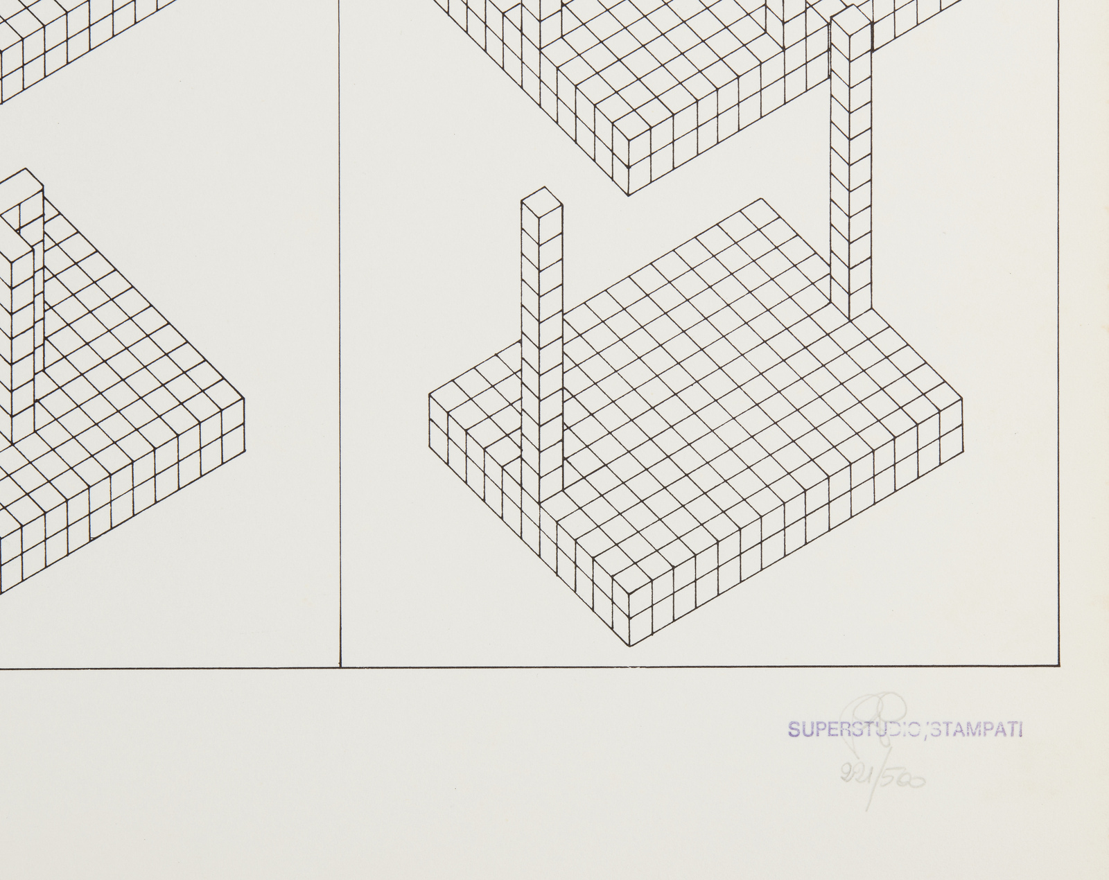 221/500. Tiratura, firma a matita e penna in basso a destra. Titolo e anno a stampa in basso a sinistra. Edizioni Plura, Milano. Il gruppo Superstudio, fondato a Firenze nel 1967 e composto da Adolfo Natalini, Cristiano Toraldo di Francia, Roberto Magris, Piero Frassinelli, Alessandro Magris, con Alessandro Poli dal 1970 al 1972, è stato attivo fino al 1978 e ha svolto attività di ricerca sperimentale e teorica sulla progettazione. Con gli Istogrammi d’Architettura, Superstudio, portava a compimento il percorso di antidesign, in cui vengono rappresentati dei diagrammi mentali liberi da modelli e imitazioni.