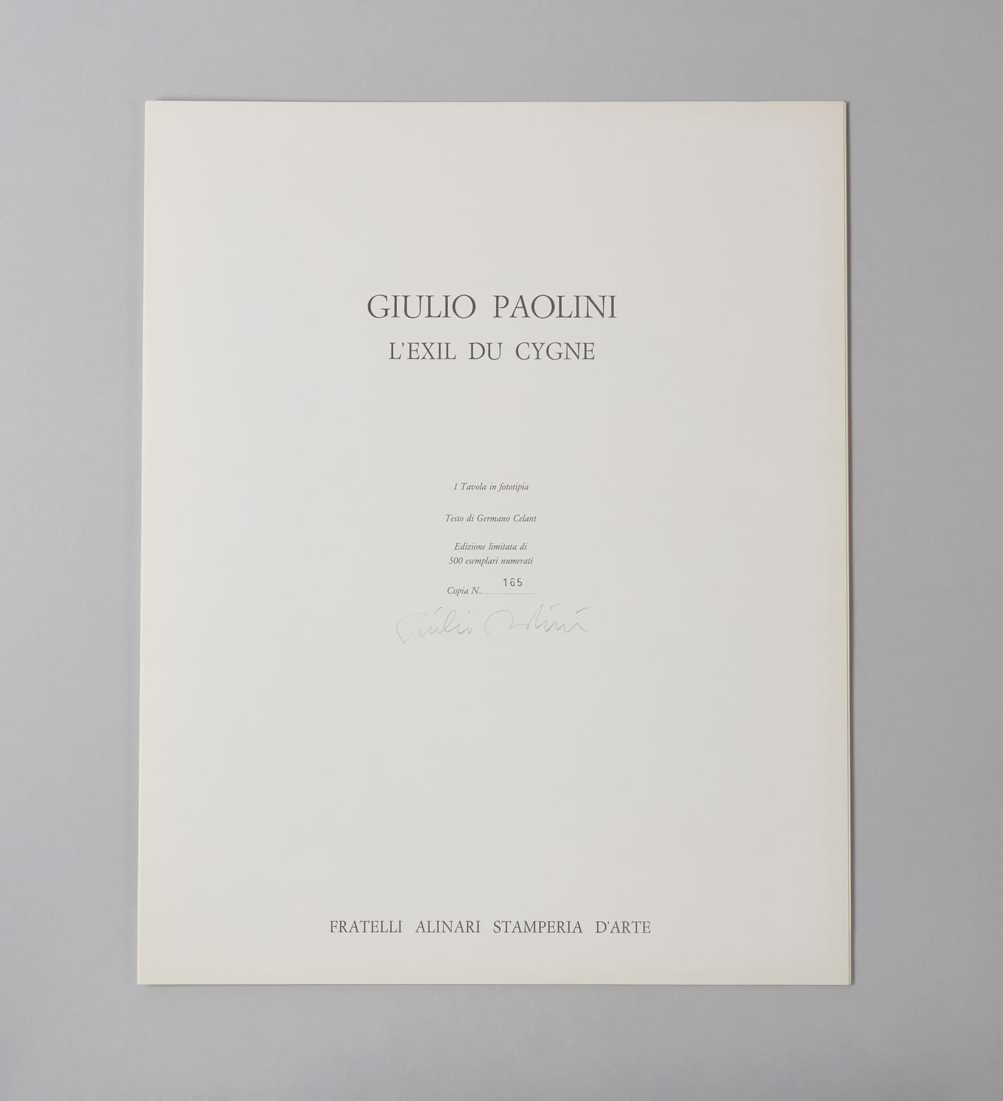 165/500. Tiratura e firma a matita sul colophon. Dimensioni grafica aperta: 50x80 cm. Testi di Germano Celant. Edizione totale: 500 esemplari numerati. Stampatore: Fratelli Alinari Stamperie d'Arte, Firenze. Pubblicazione: Impressions graphiques. L’opera grafica 1967-1992 di Giulio Paolini (Turin: Marco Noire Editore,1992), cat. no. 44.