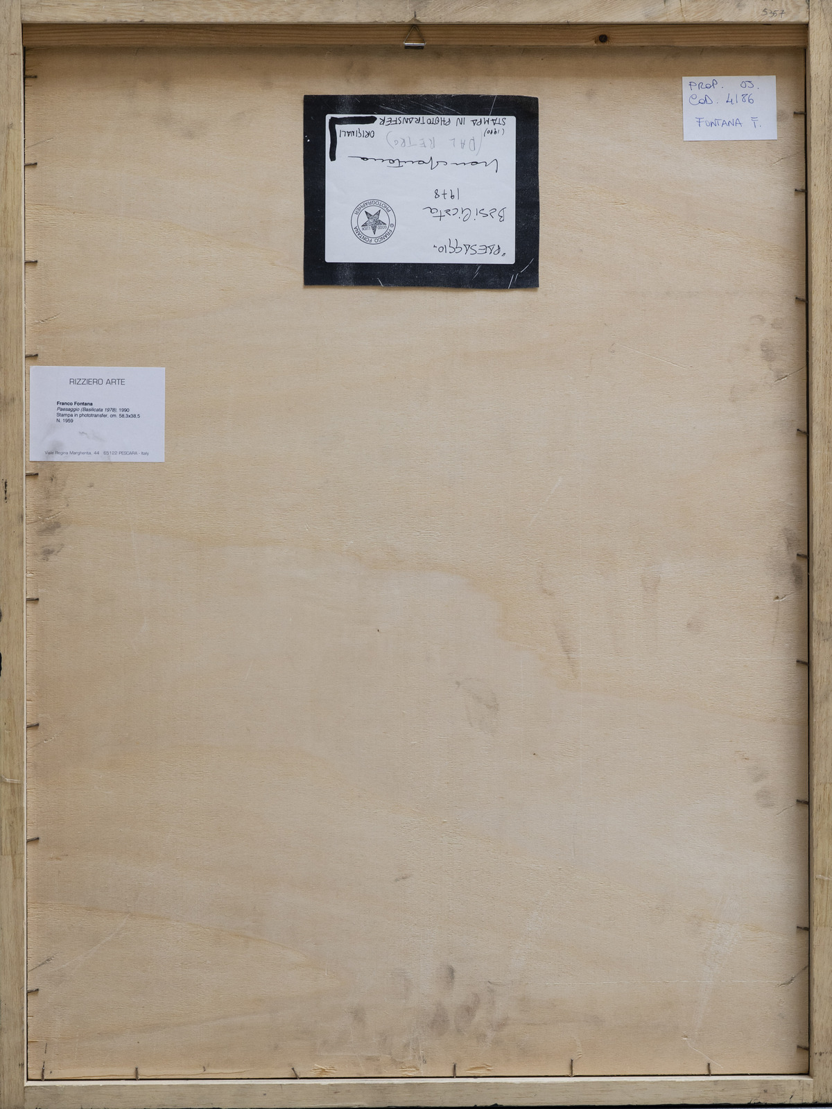 Firma e anno in basso a destra. Al retro cartiglio descrittivo Rizziero Arte riportante il relativo numero d'inventario e timbro Franco Fontana photographer. 1978-1990.