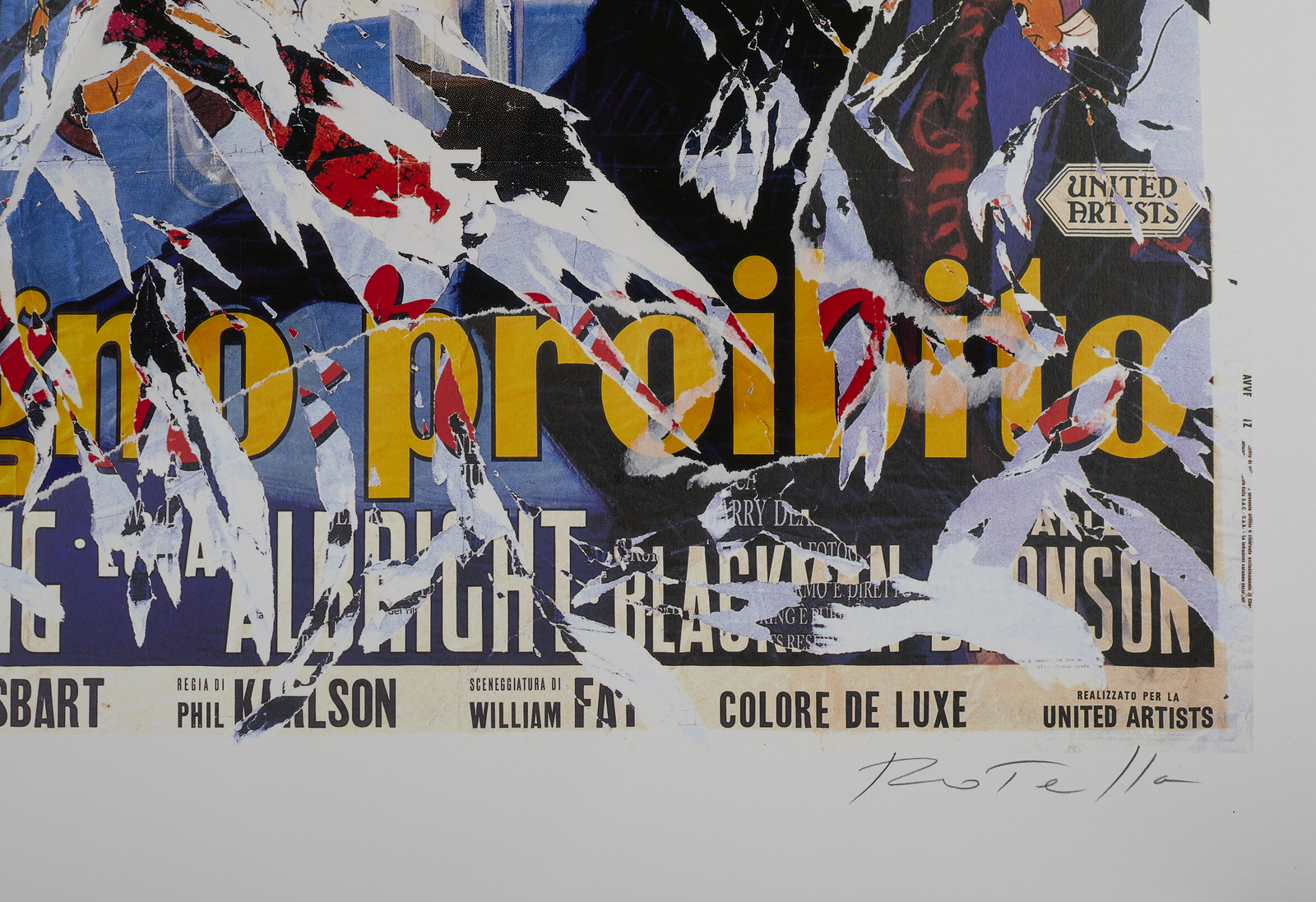 P.a. Tiratura e firma in basso a matita. Timbro a secco Fondazione Rotella, Milano, in basso a sinistra. Edizione totale: 125 + L + 20 p.a. Pubblicazione: Mimmo Rotella multiples décollages a cura di Elena Pontiggia, Silvana Editoriale, p.110.