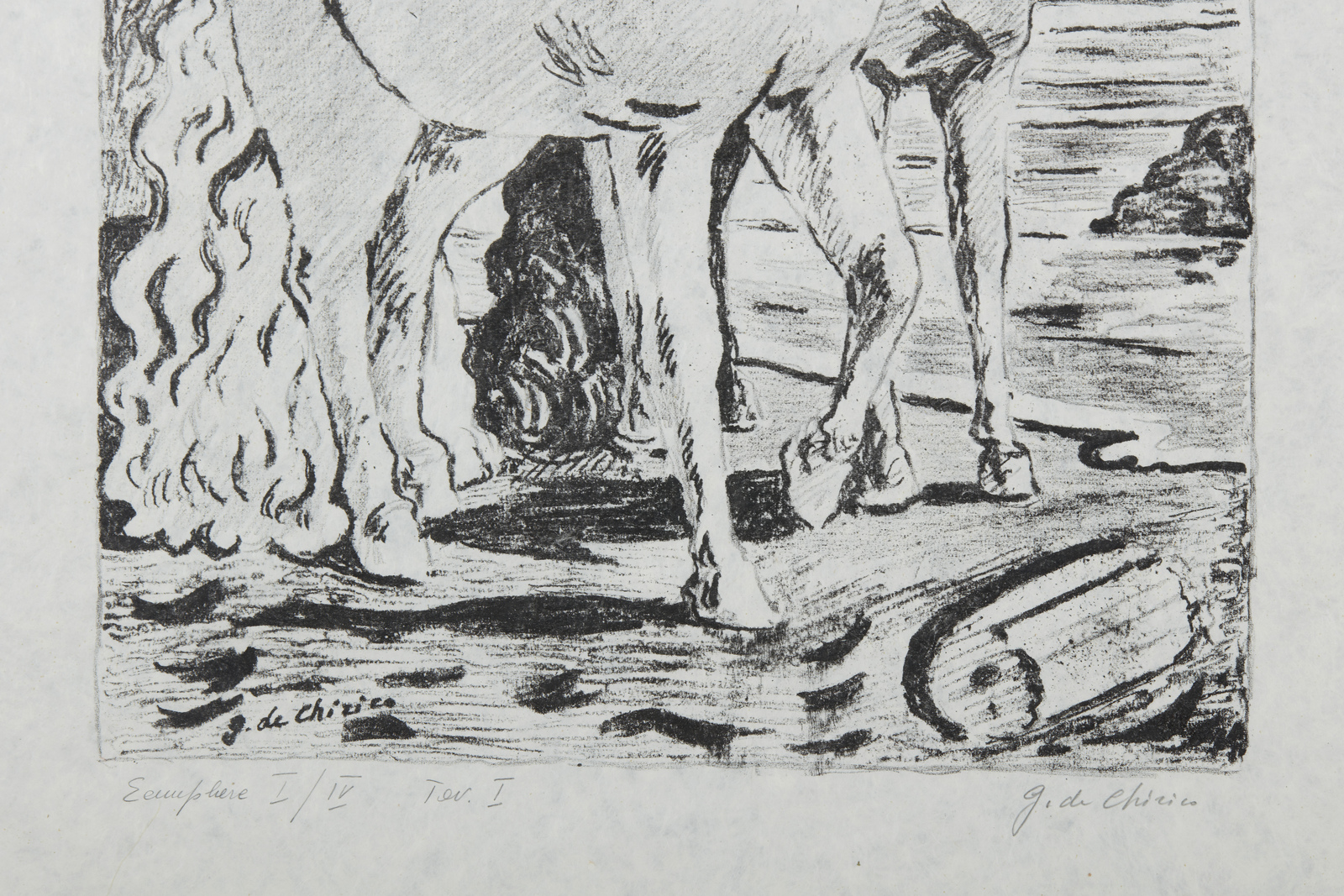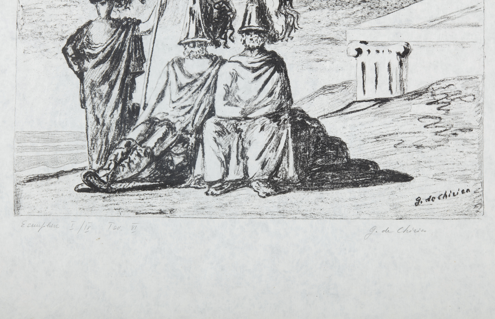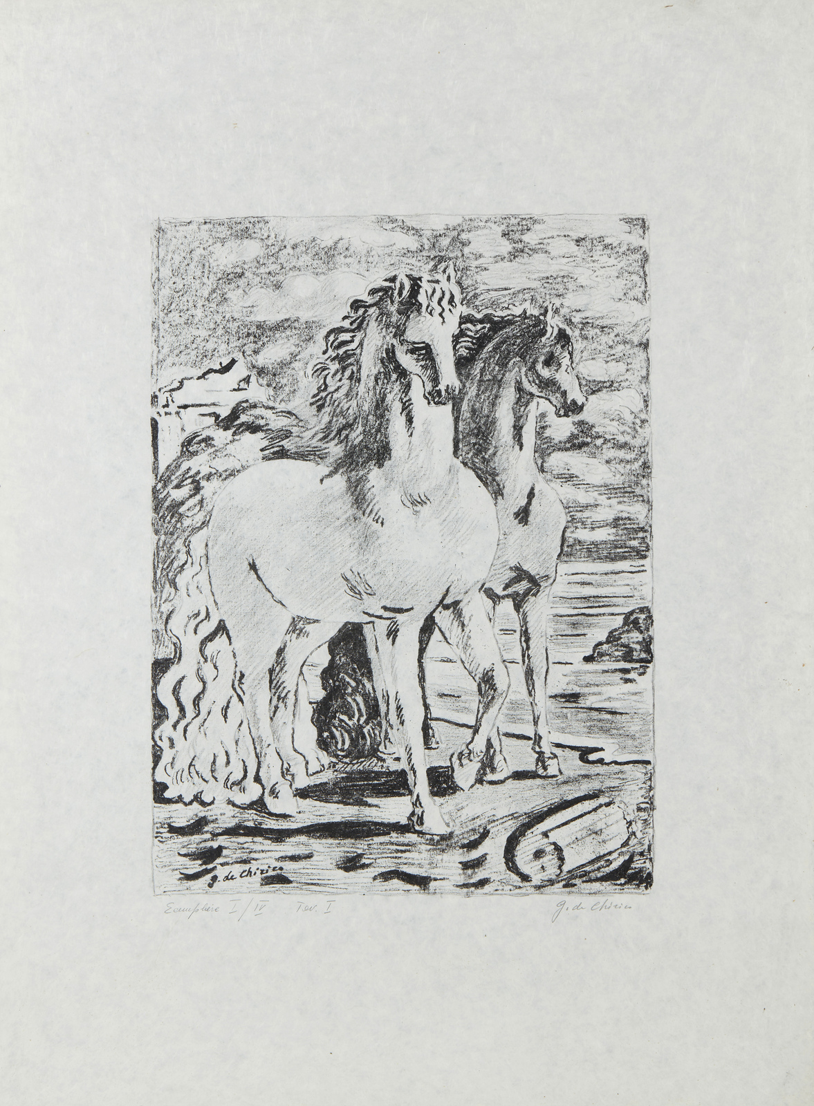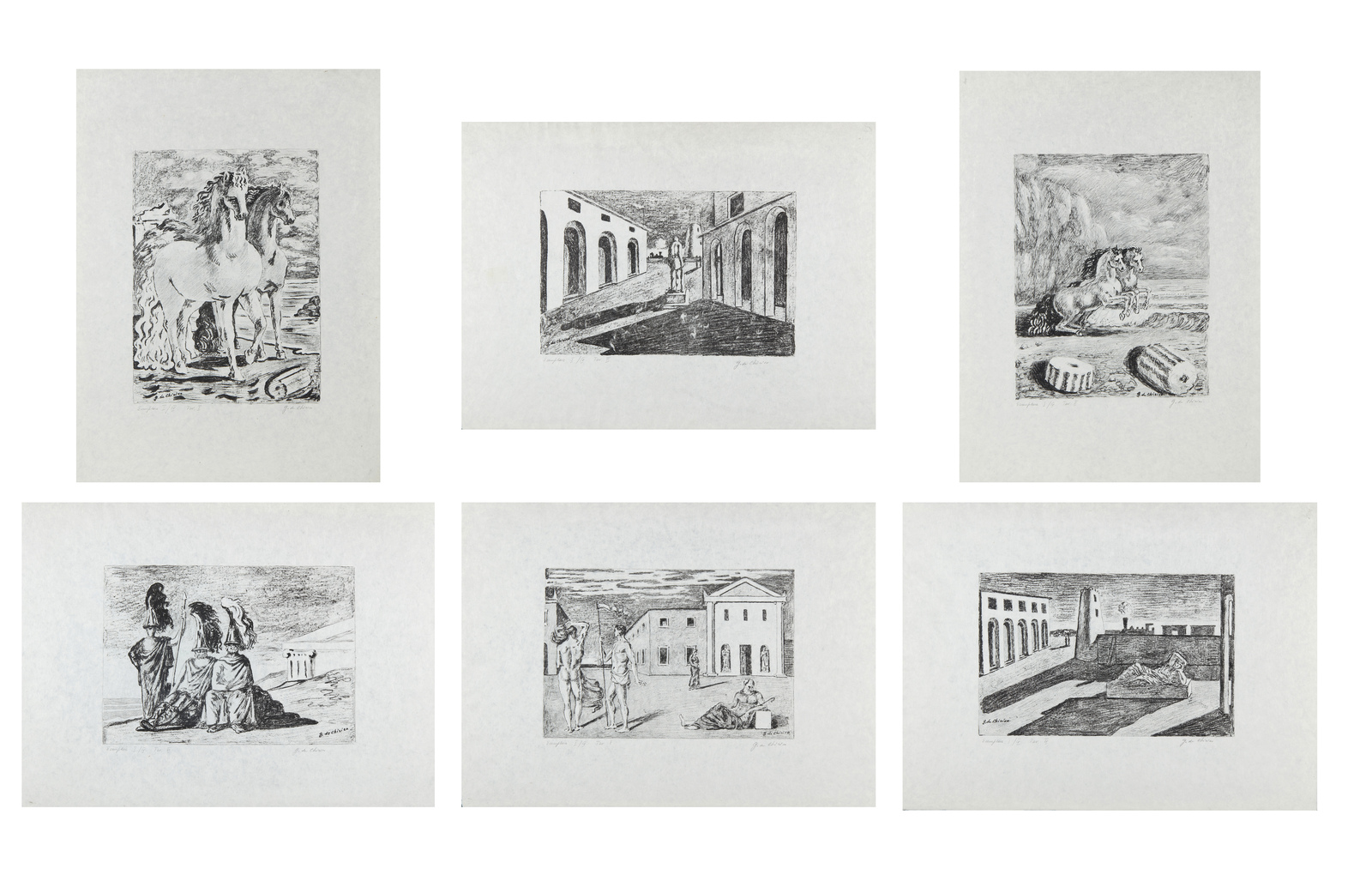 I/IV. Ogni foglio presenta tiratura e firma a matita in basso. Dimensione lastre:46x34. 44.5x35. 29.5x46. 29.5x46.5. 31x45.5. 32.5x46 cm. Cartella completa composta da n.6 litografie disegnate dall'artista su carta lucido e trasportate su pietra dagli stampatori Igino Alessandrini e Roberto Bulla, Roma. Carta Cartiere Ventura di Cernobbio. Edizioni Carlo Bestetti, Roma. Edizione totale: 99 esemplari a colori su carta amano numerati da 1 a 99. 4 esemplari su carta Japon numerati da I a IV. 15 esemplari fuori commercio numerati da I a XV. 7 esemplari ad personam. alcune prove d'artista + alcuni esemplari colorati a mano. 1. Cavalli antichi2. Cavalli sulla sponda dell'Egeo3. Solitudine dell'uomo politico4. L'enigma del ritorno.5. La partenza di Giasone6. I guerrieri di ritorno da Troia.Pubblicazione: Giorgio De Chirico catalogo dell'opera grafica 1921 -1969 a cura di Antonio Vastano, Bora Edizioni, pp. 223-235.