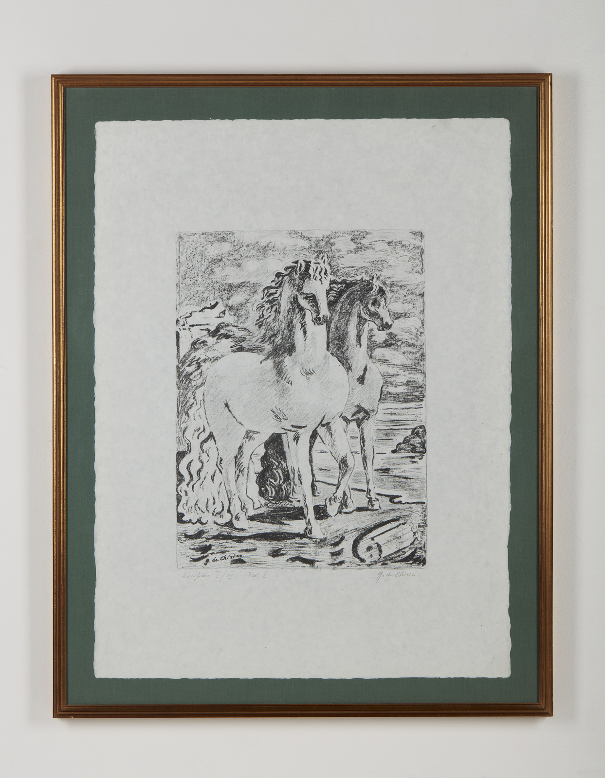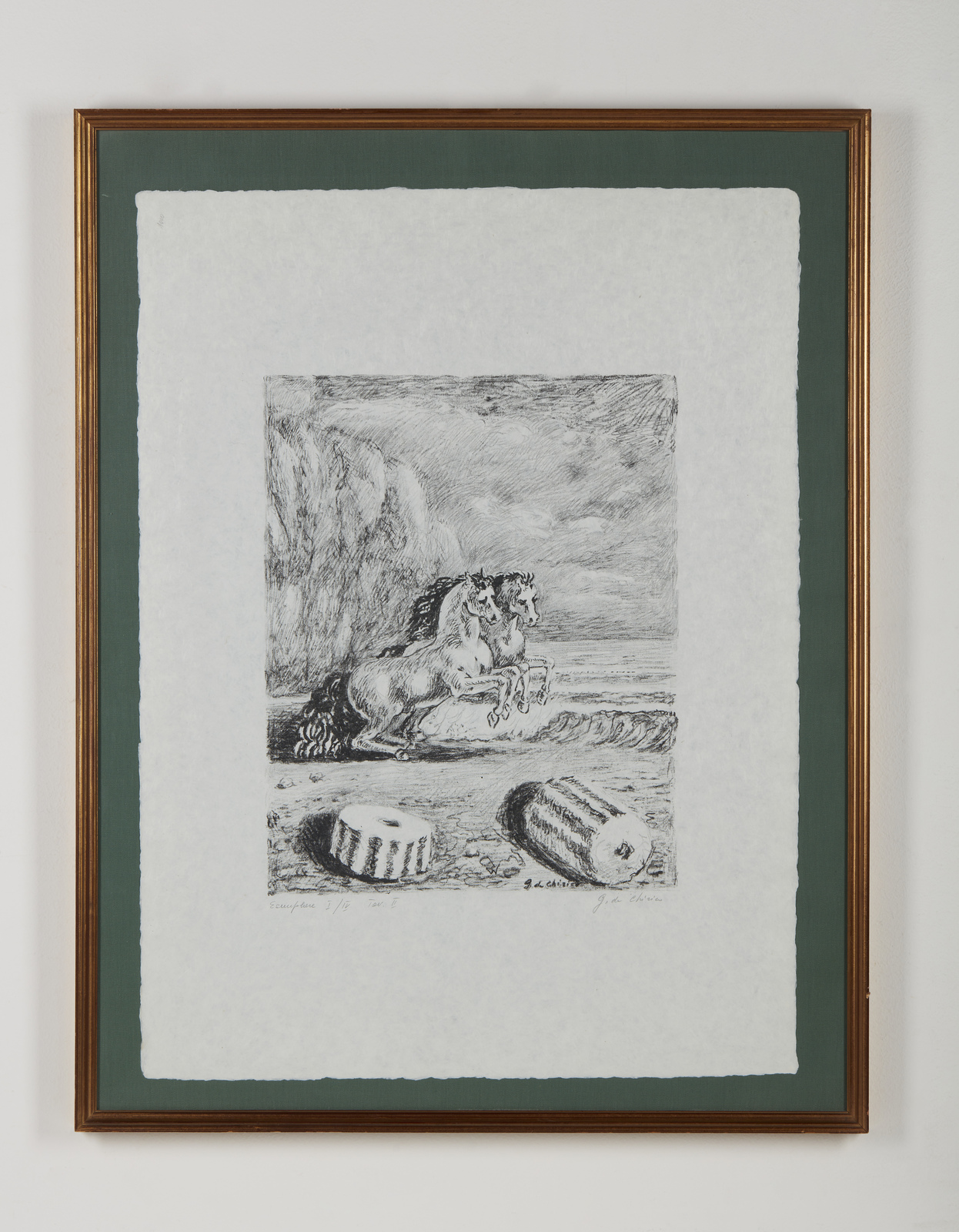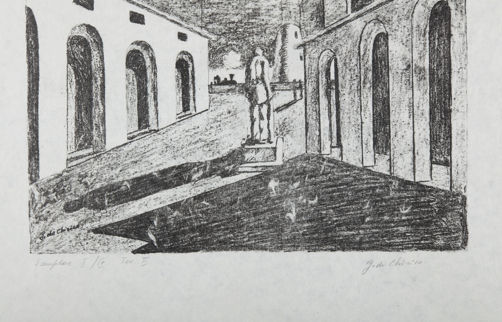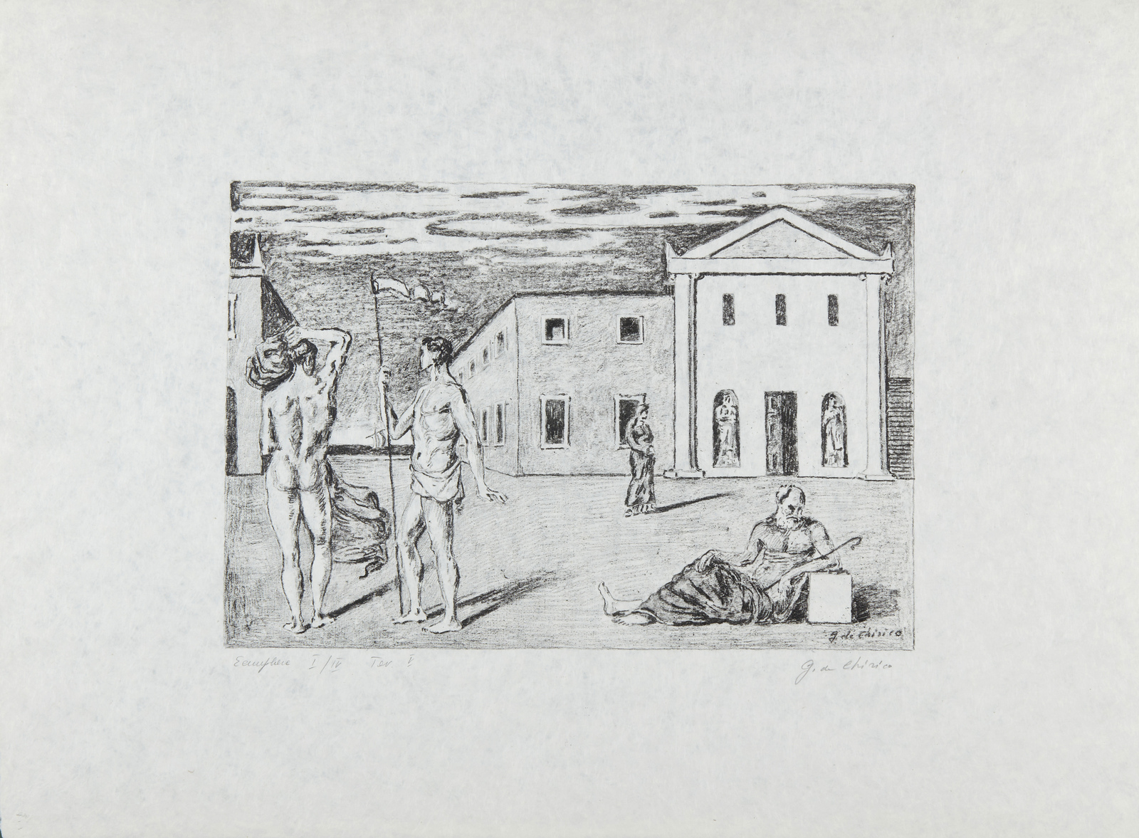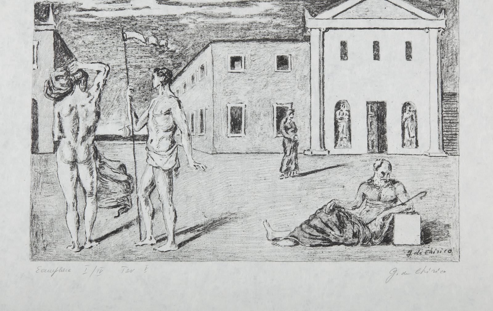 I/IV. Ogni foglio presenta tiratura e firma a matita in basso. Dimensione lastre:46x34. 44.5x35. 29.5x46. 29.5x46.5. 31x45.5. 32.5x46 cm. Cartella completa composta da n.6 litografie disegnate dall'artista su carta lucido e trasportate su pietra dagli stampatori Igino Alessandrini e Roberto Bulla, Roma. Carta Cartiere Ventura di Cernobbio. Edizioni Carlo Bestetti, Roma. Edizione totale: 99 esemplari a colori su carta amano numerati da 1 a 99. 4 esemplari su carta Japon numerati da I a IV. 15 esemplari fuori commercio numerati da I a XV. 7 esemplari ad personam. alcune prove d'artista + alcuni esemplari colorati a mano. 1. Cavalli antichi2. Cavalli sulla sponda dell'Egeo3. Solitudine dell'uomo politico4. L'enigma del ritorno.5. La partenza di Giasone6. I guerrieri di ritorno da Troia.Pubblicazione: Giorgio De Chirico catalogo dell'opera grafica 1921 -1969 a cura di Antonio Vastano, Bora Edizioni, pp. 223-235.