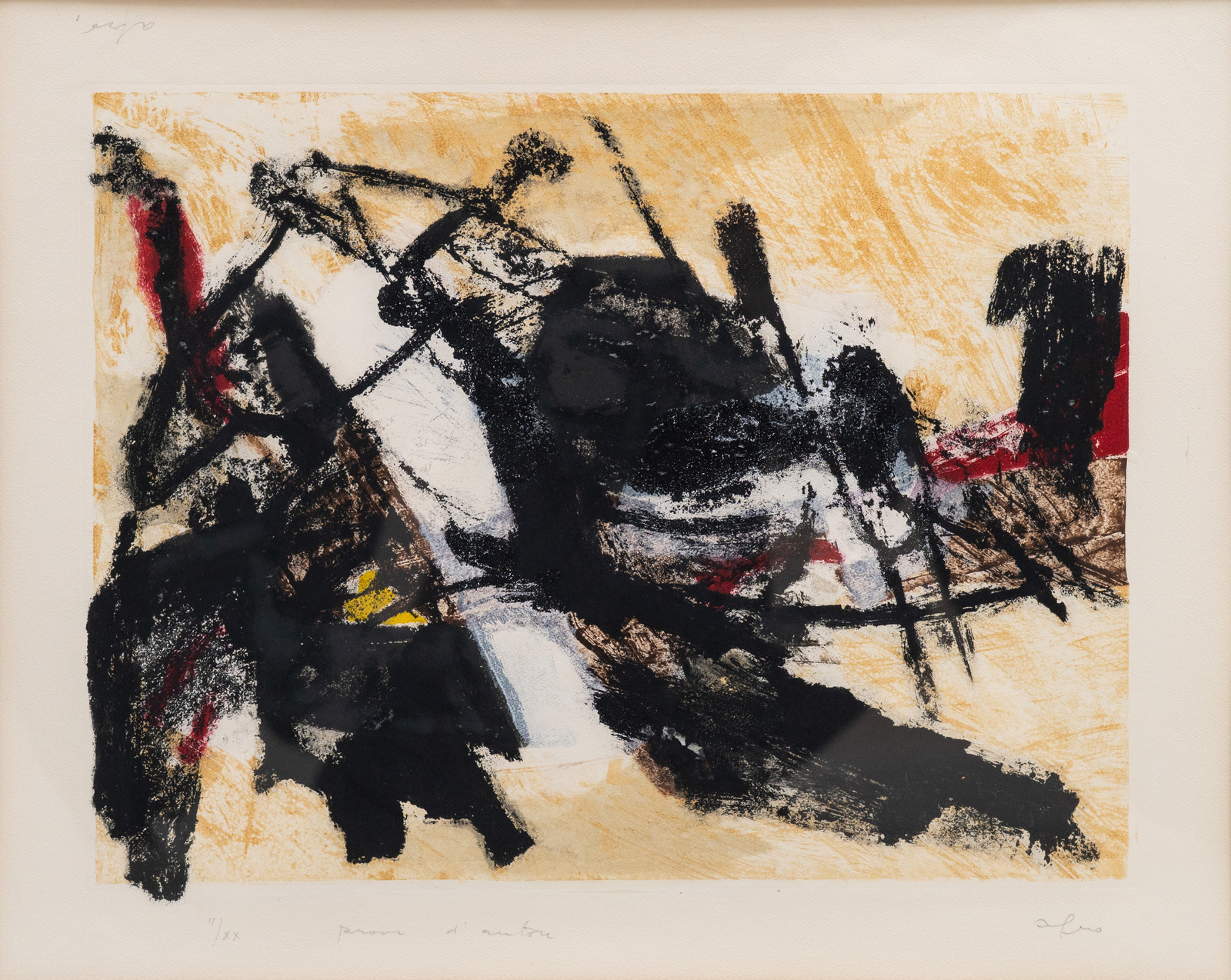 II/XX prova d'autore. Tiratura e firma in basso a matita. Firma a matita in alto a sinistra. Titolo al retro. Dimensione lastra: 40x52 cm. Edizione totale: 90 +20 p.d.a. +21 p.d.s. Pubblicazione: Afro Catalogo ragionato delle incisioni e litografie a cura di Enrico Crispolti , Top Graphic, 1986, n.6. Lievi difetti. Il foglio è stato leggermente rifilato ai lati.