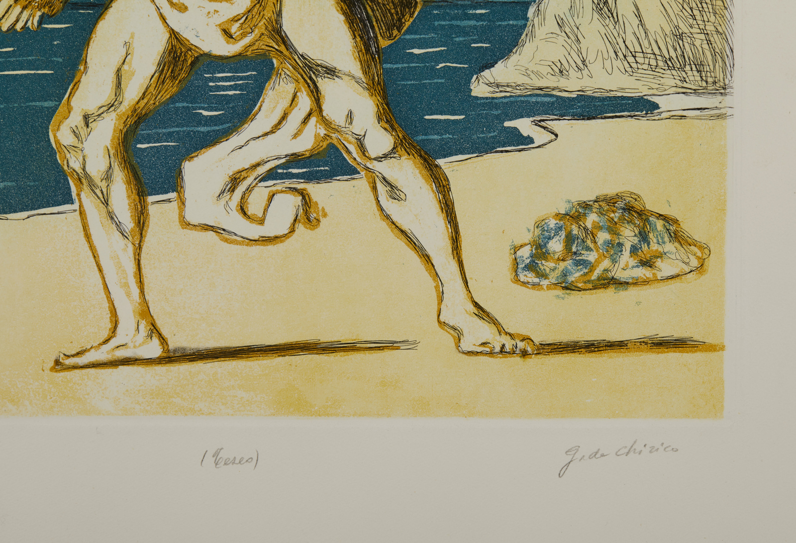 6/50. Tiratura, firma e titolo in basso a matita. Dimensioni lastra: 41x36,7cm. Timbro a secco Giorgio De Chirico in basso a sinistra. Stampatore Alberto Caprini, Roma. Edizione totale: 50 esemplari numerati da 1/50 a 50/50. 15 esemplari numerati da I/XV a XV/XV +12 p.d.a. Pubblicazione: Giorgio De Chirico - Catalogo dell'opera grafica 1969-1977, Edizioni Bora, 1999, a cura di Edoardo Brandani, p.17, tav.4. Lievi difetti.
