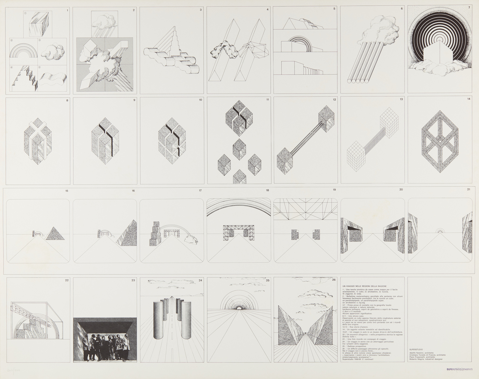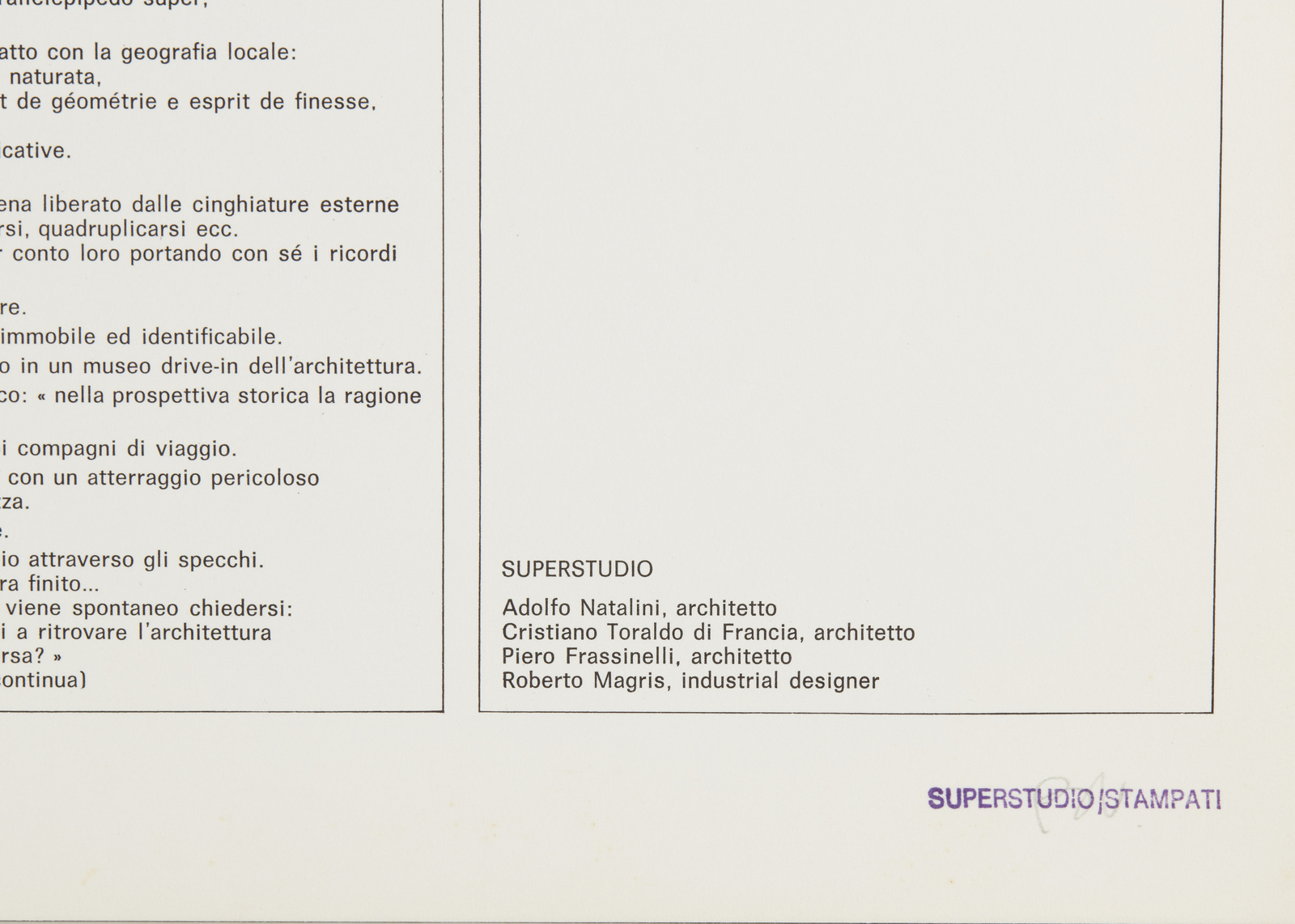 260/500. Tiratura e firma monogrammata di A. Natalini in basso a destra a penna. Titolo e anno stampati. Timbro a secco Plura Edizioni in basso a sinistra. Pubblicazione: P. Lang, W. Menking, Superstudio: lIfe Without Objects, Milano, Skira Editore, 2003, pp. 88-89. Il gruppo Superstudio, fondato a Firenze nel 1967 e composto da Adolfo Natalini, Cristiano Toraldo di Francia, Roberto Magris, Piero Frassinelli, Alessandro Magris, con Alessandro Poli dal 1970 al 1972, è stato attivo fino al 1978 e ha svolto attività di ricerca sperimentale. e teorico sul design. Lievi difetti.