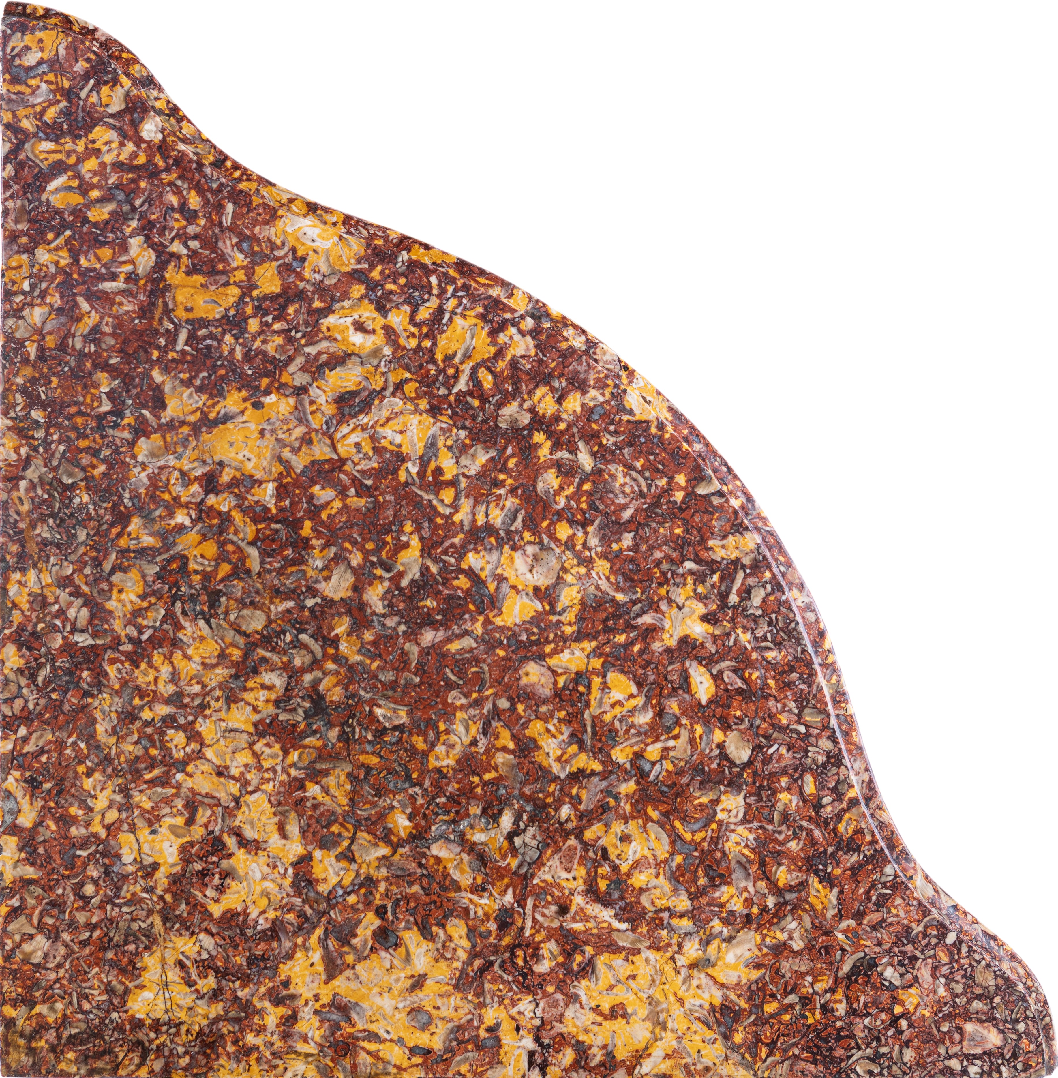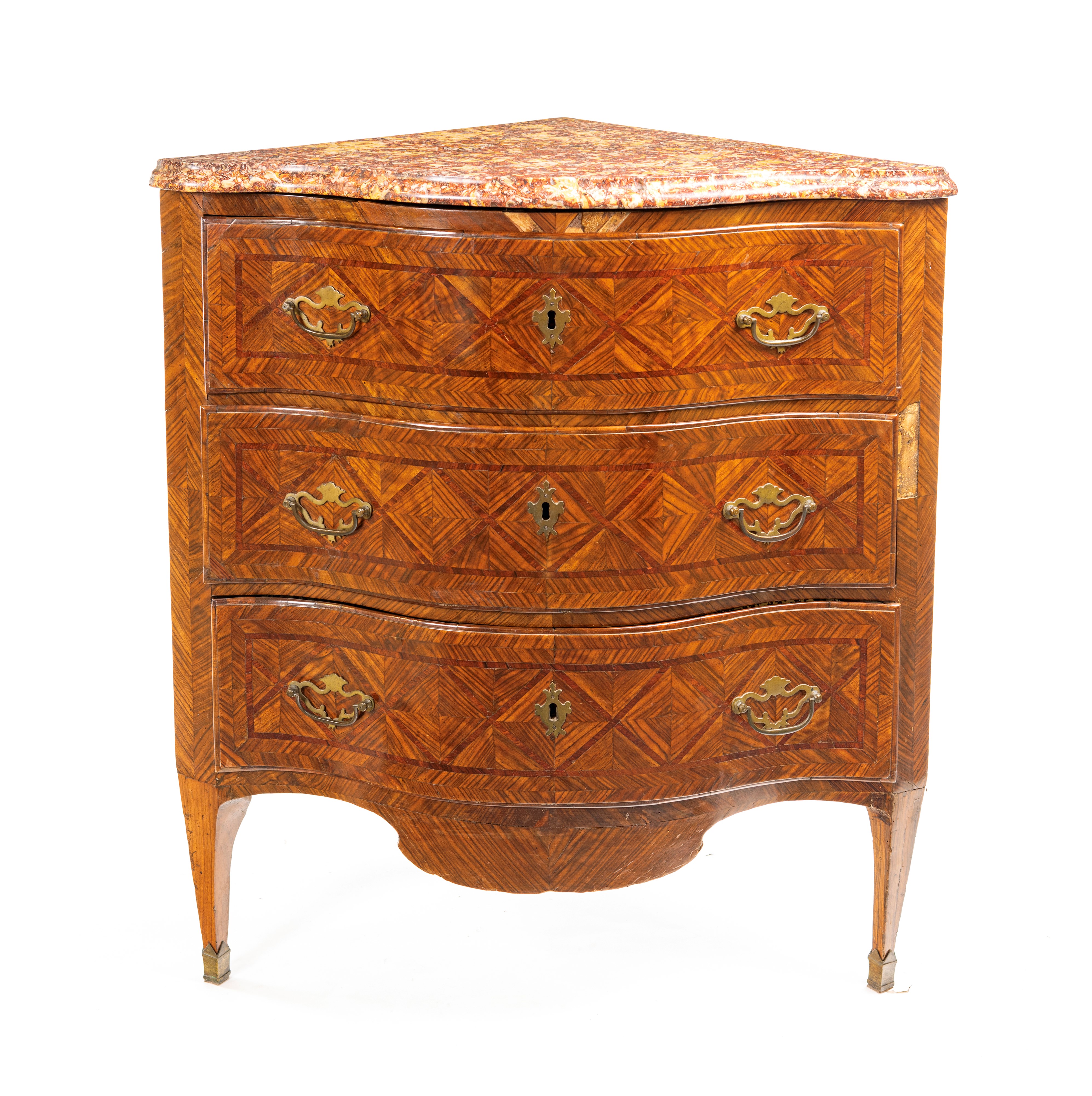 cm 95x88x62 con facciata sagomata impiallacciata a spina di pesce, scandita da tre cassetti con bocchette e maniglie in bronzo; piano sagomato con ciglio modanato in marmo broccatello di Spagna, piedi rastremati