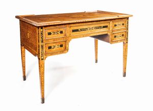 cm 83,5x131x74 decorata ad intarsio in legno di frutto naturale ed ebanizzato con dettagli pirografati; piano [..]