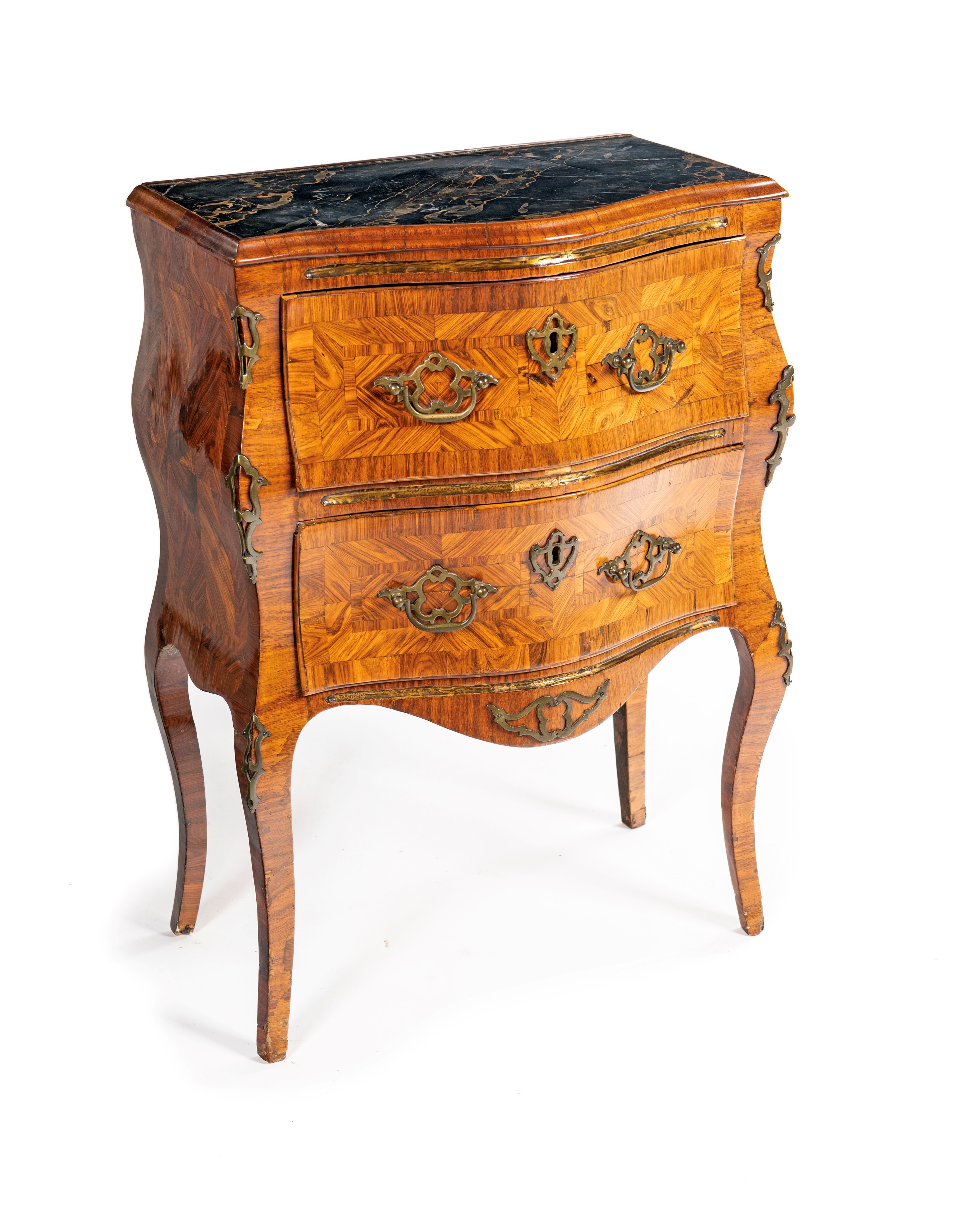 cm 77,5x54x33 con finiture ornamentali e funzionali in bronzo; piano incassato in marmo portoro, due cassetti frontali separati da traverse con scanalatura dorata, spigoli curvilinei e gambe sagomate