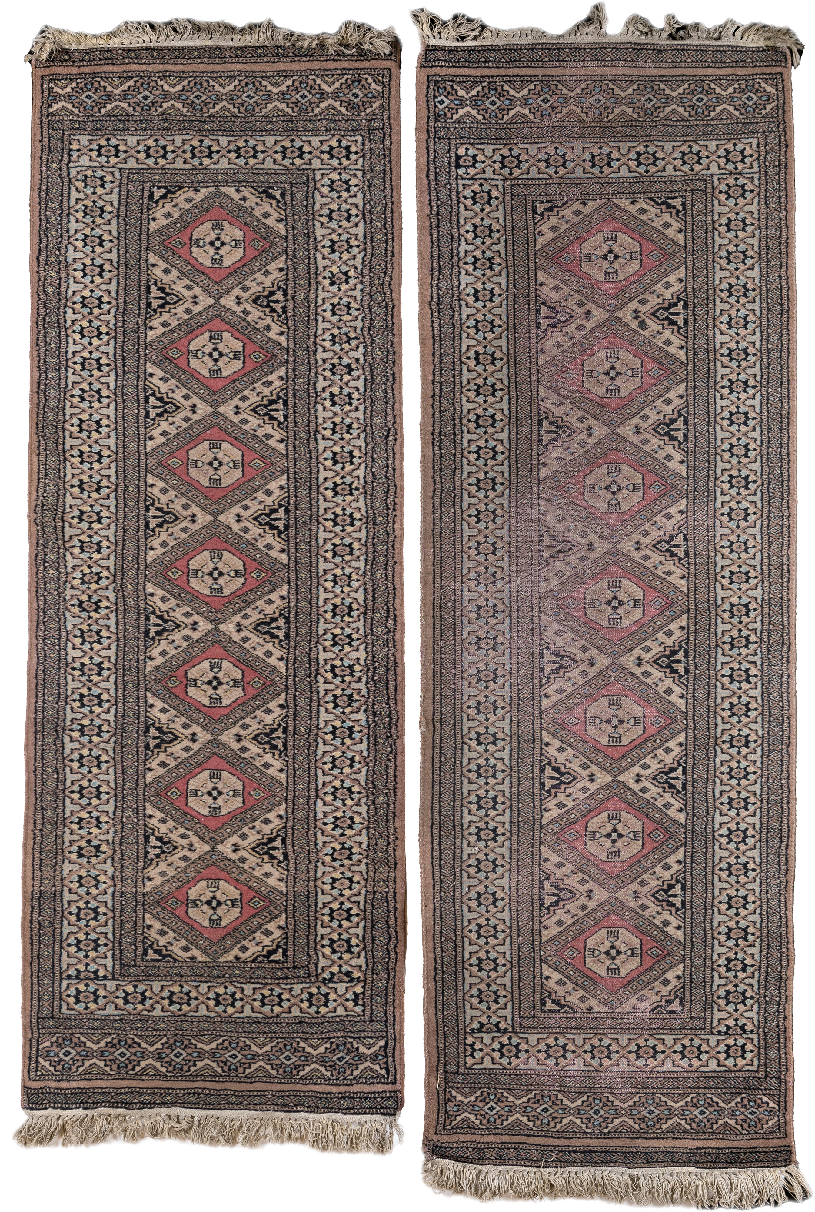 cm 194x67 ognuna percorsa da sette losanghe in sequenza nei toni del rosa, del bianco e del bruno entro molteplici bordure. Una delle due molto consunta e con lievi differenze di misura