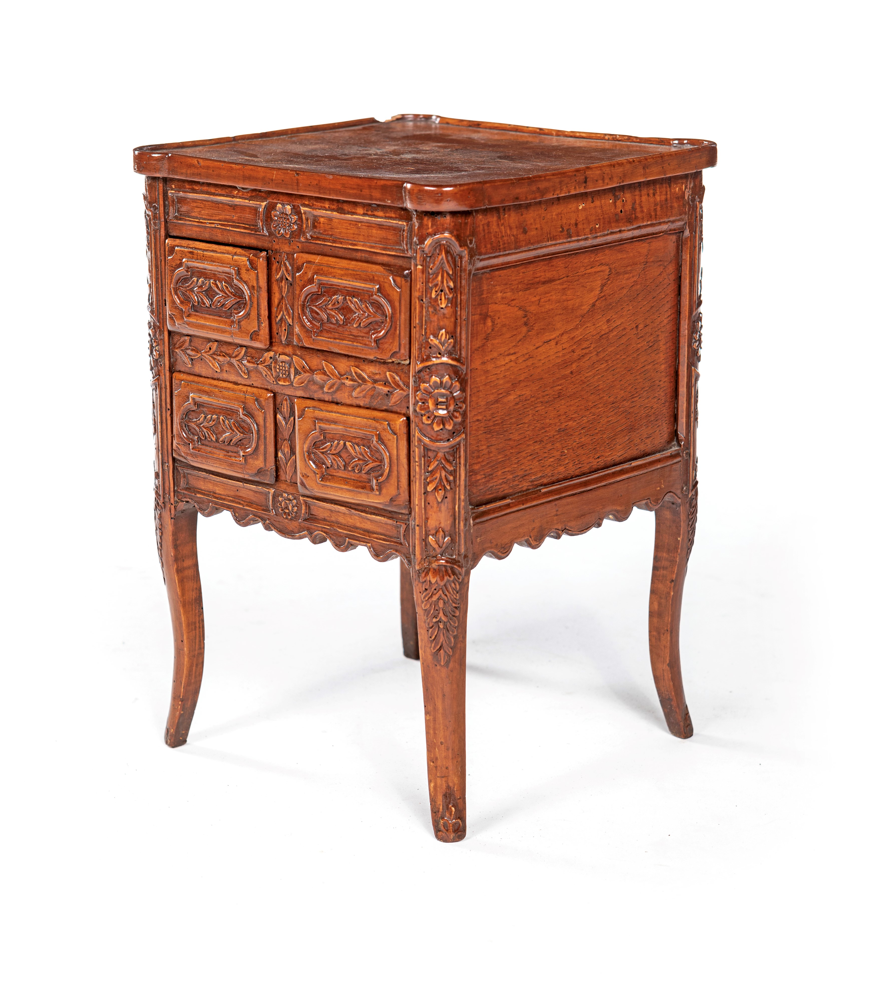 con quattro tiretti disposti su entrambe le facciate, caratterizzati da rilievi vegetali minuziosamente intagliati; grembiale mistilineo, gambe lievemente sagomate