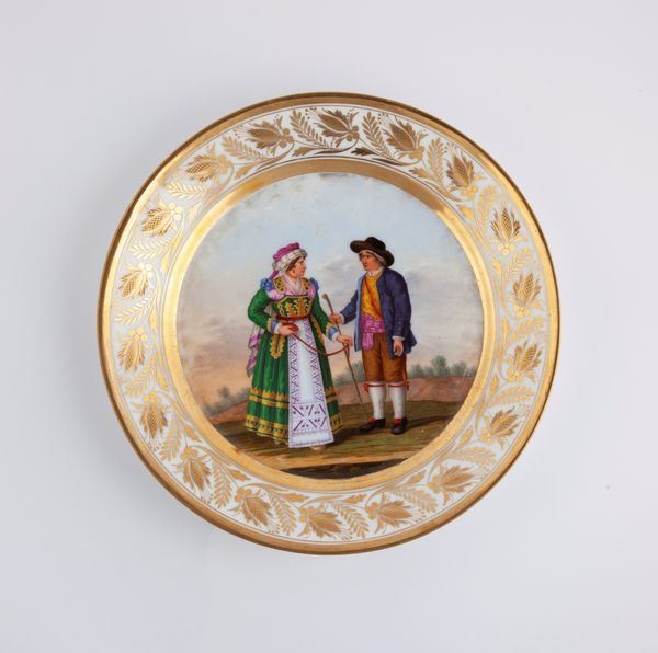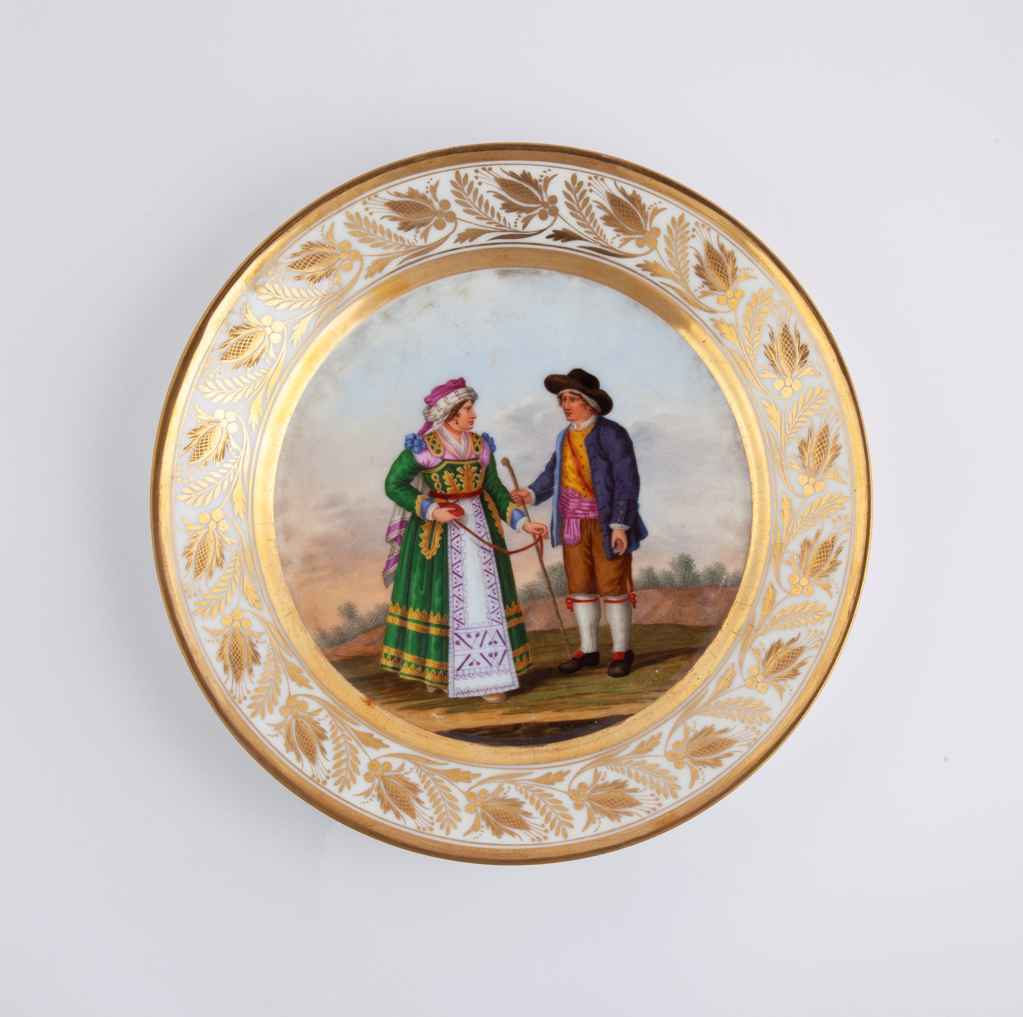 caratterizzato al centro da due due figure in costume regionale dipinte in vivace policromia; tesa decorata in oro a motivi naturalistici in sequenza. Iscritto al verso, in corsivo a pennello: Costume del Paese di Frattura Provincia dell'Aquila Abruzzo Ultra, firmato e datato: Accietto, Napoli 1836