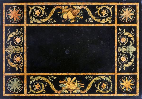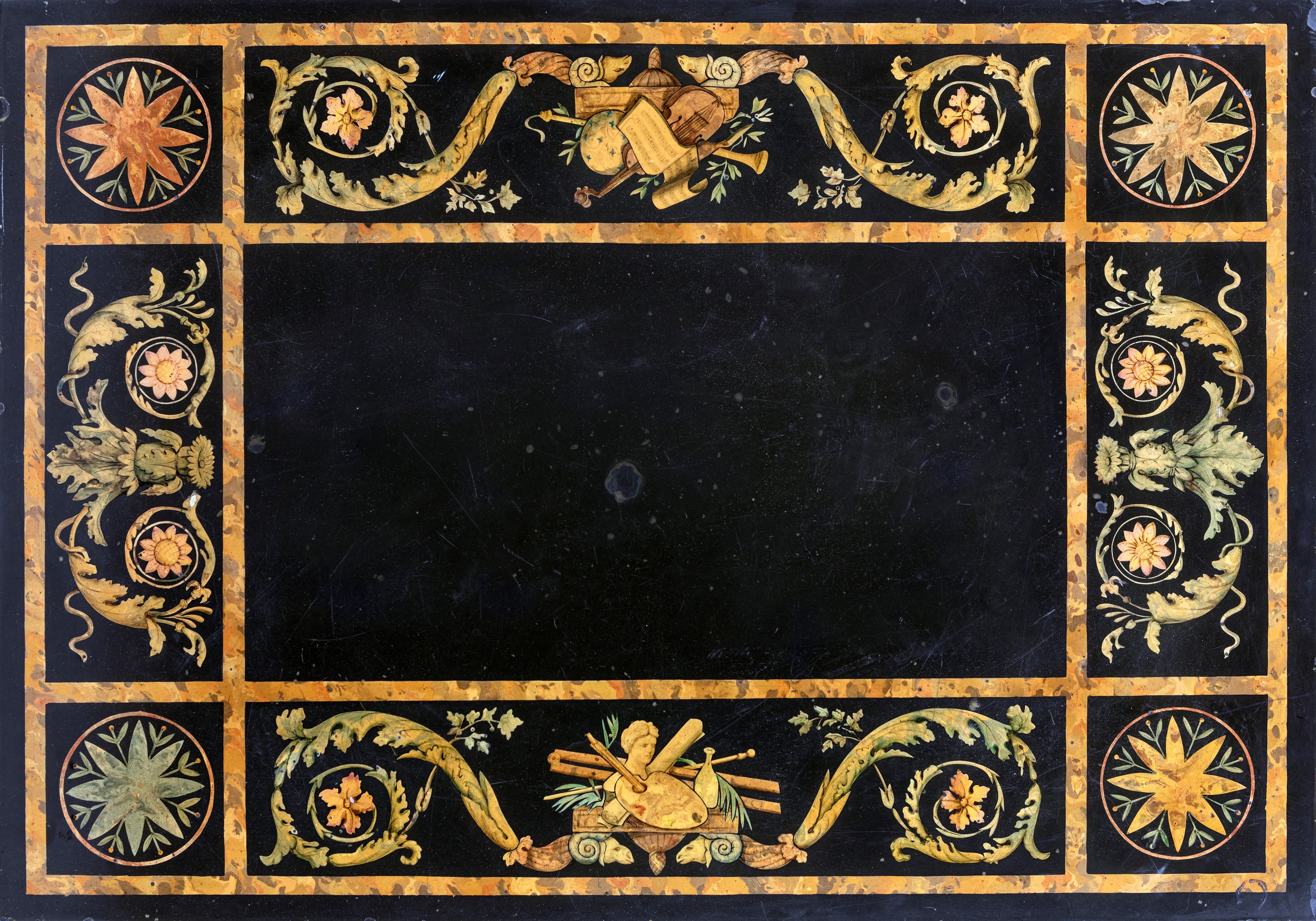 piano rettangolare nero decorato da una grande fascia perimetrale con volute vegetali che si dipartono da rhyton contrapposti; corolle angolari completano la decorazione. Base in metallo con gambe a forma di cigno