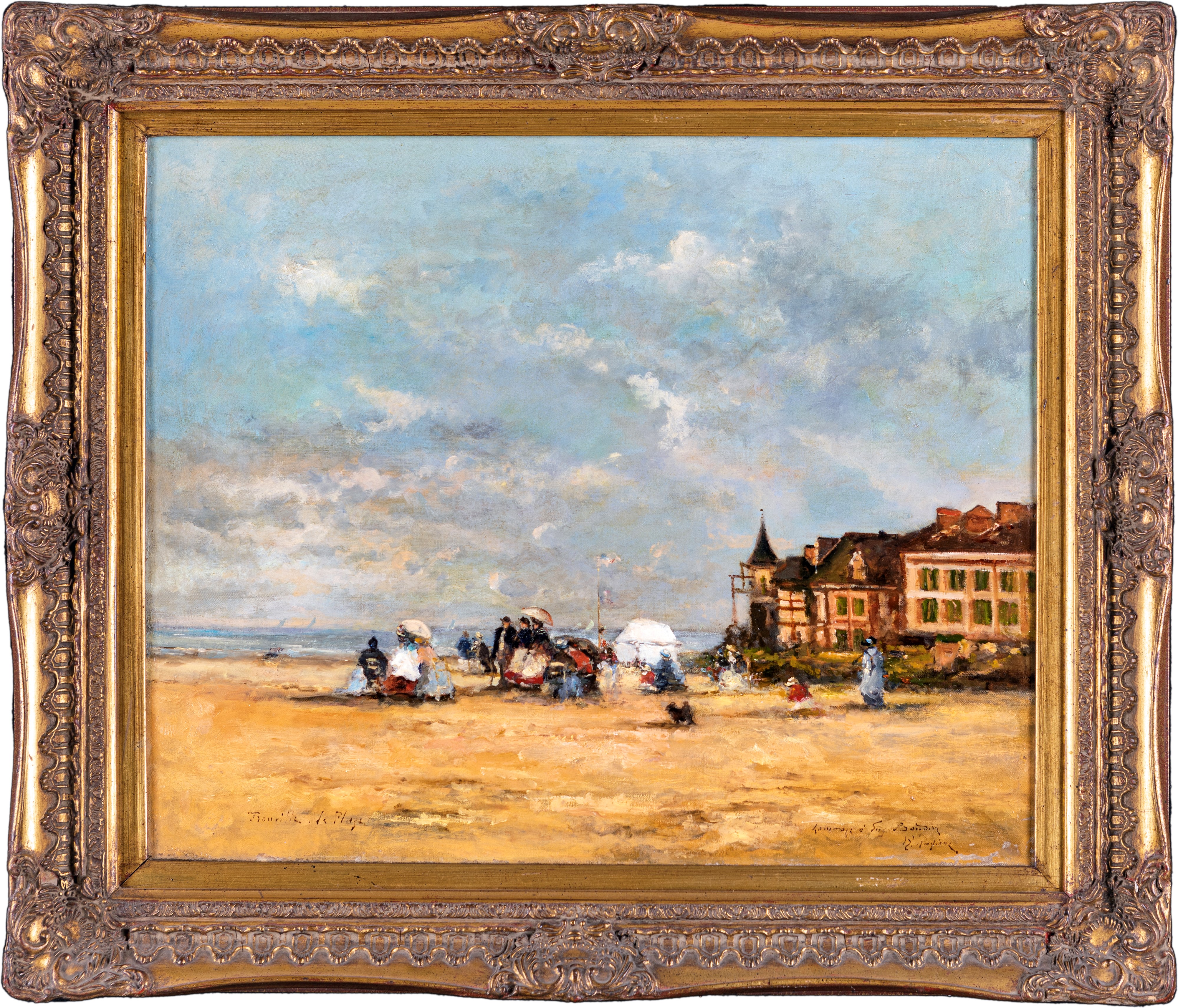 inizi del XX secolo Iscrito in basso a sinistra. Trouville. La plage, e in basso a destra Hommage à Eug. Boudin. Firmato in basso a destra R. Ragione.