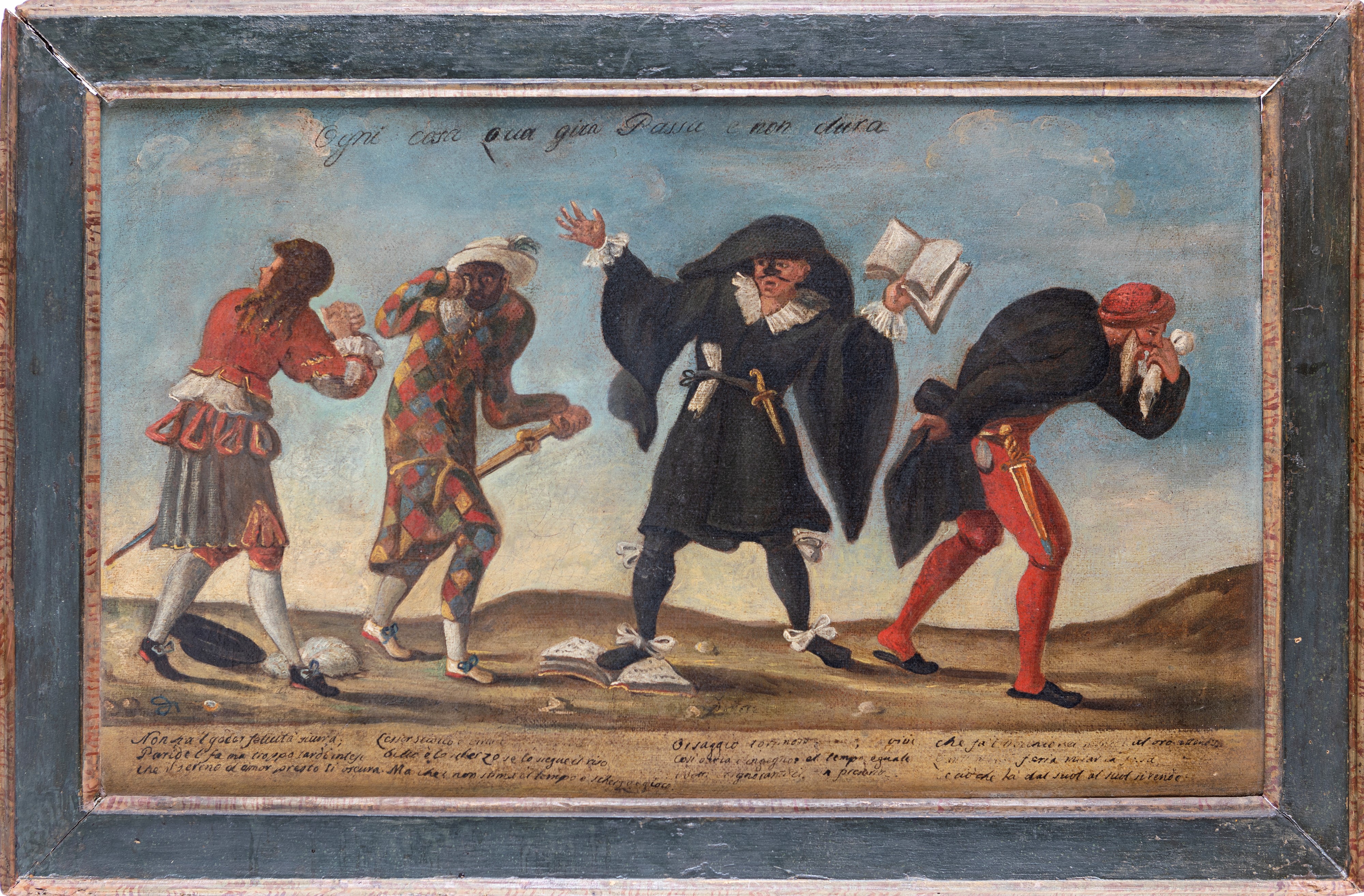 Olio su tela, cm 35x55 - in cornice: 44x66 Il dipinto presenta un'iscrizione in alto sulle figure, che recita: Ogni cosa qua gira, passa e non dura. Al di sotto delle maschere, sono presenti versi di non facile lettura che identificano il carattere di ciascuna.