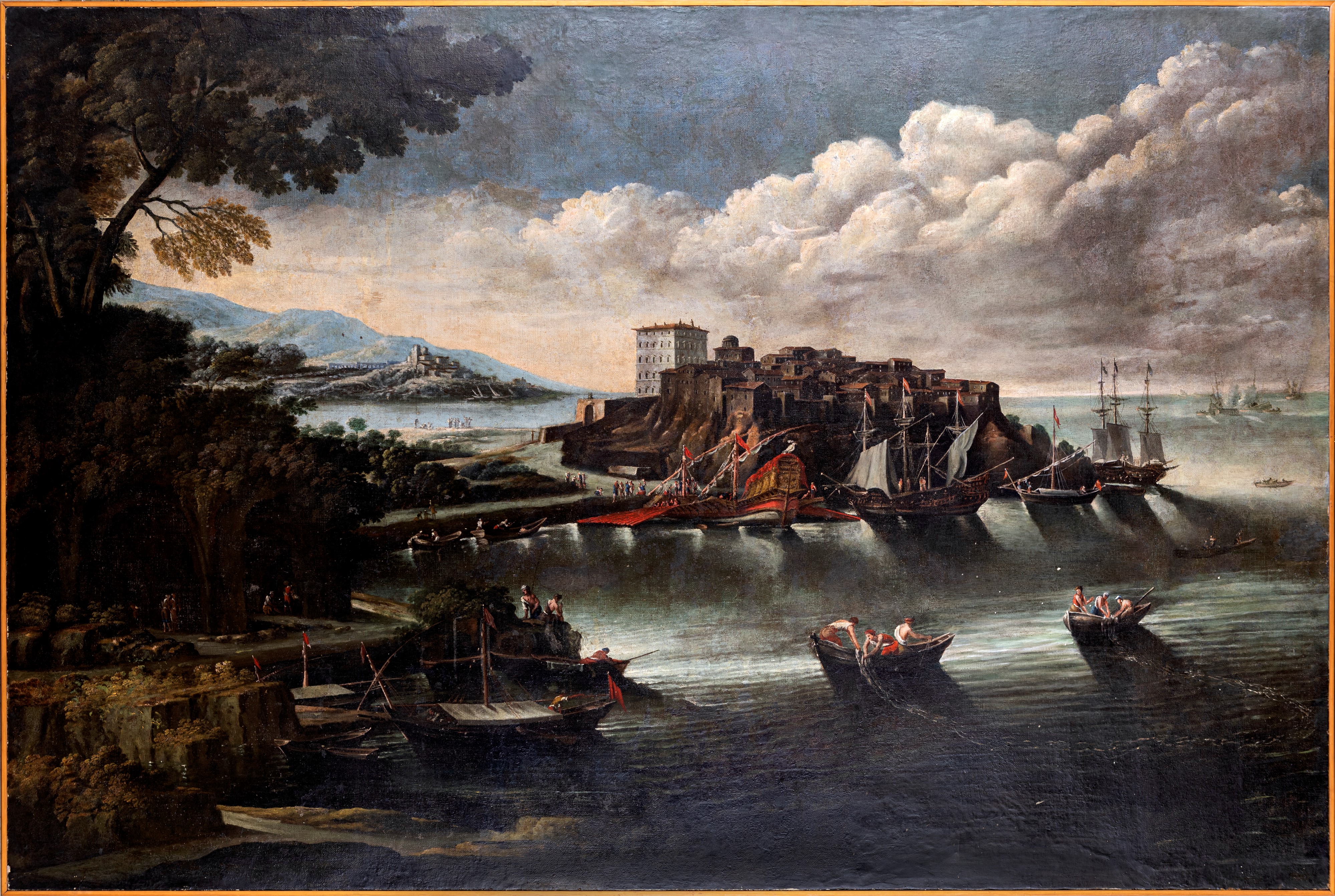 olio su tela, cm 148x220 s.c. Suggestiva veduta con isole in mezzo al mare e imbarcazioni. La composizione, la pennellata veloce, e la scelta dei toni rimandano all'opera di un pittore fiammingo attivo in Italia. Per un possibile confronto vedere il dipinto conservato presso la Galleria Spada di Roma alla dicitura Mare in Tempesta, Anonimo fiammingo del XVII secolo