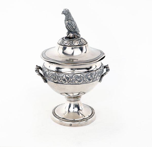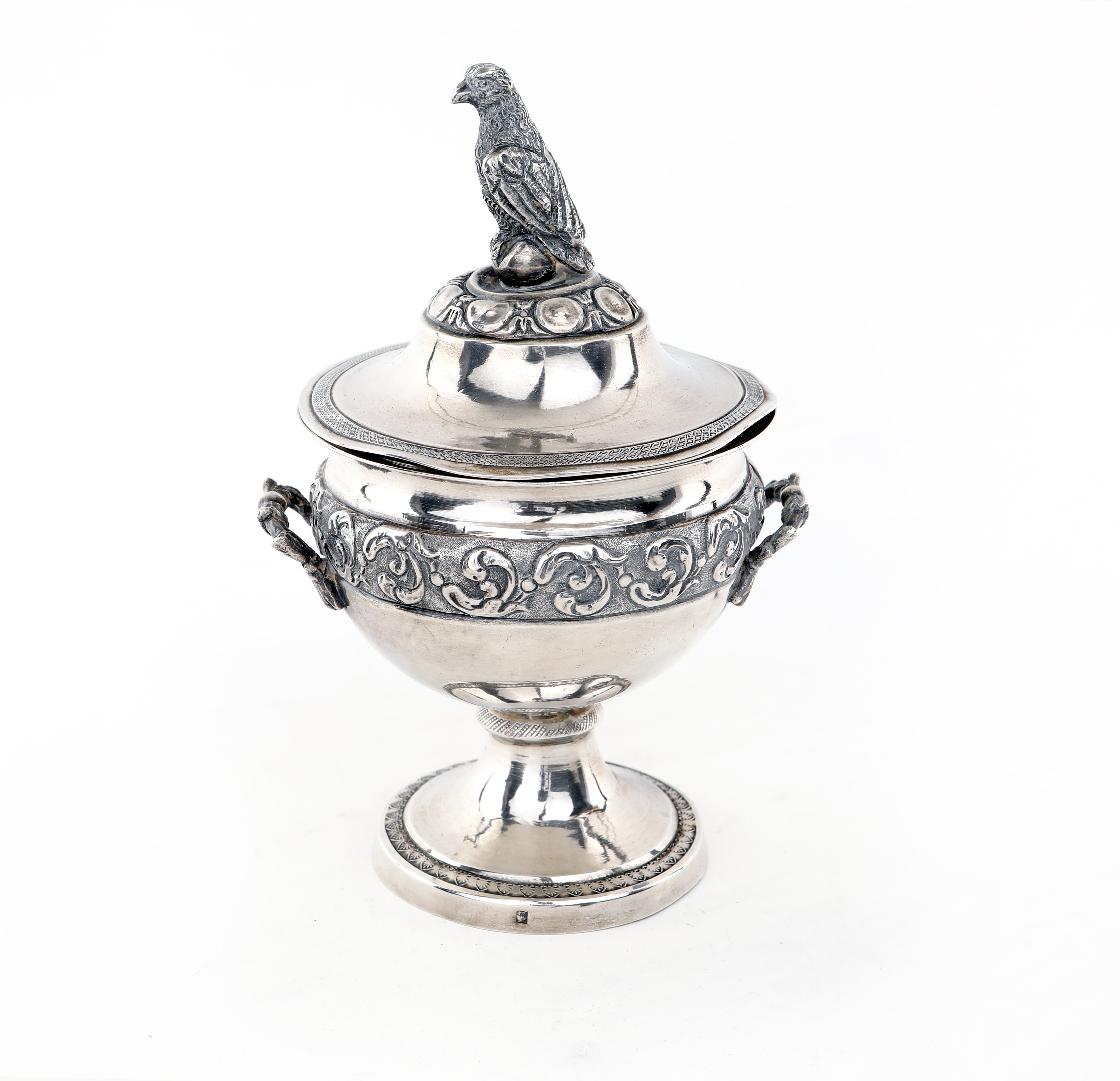 a forma di coppa biansata su piede circolare con profilo a palmette, decorata da una fascia grezza su cui emergono volute vegetali sbalzate; coperchio sormontato da figura scultorea di rapace